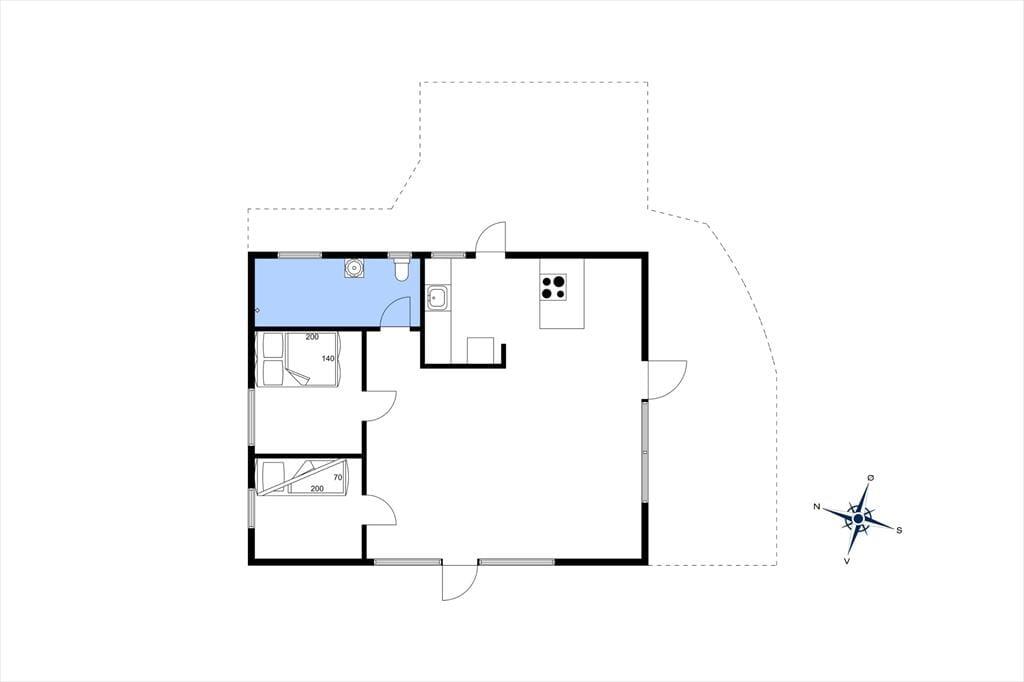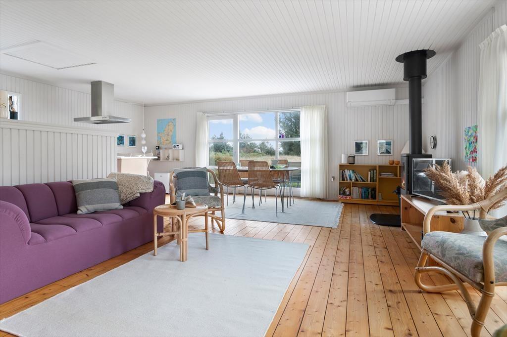 Indenfor møder du en lys og indbydende atmosfære, hvor det hyggelige opholdsmiljø samler køkken og stue i ét. Den knitrende brændeovn og den effektive varmepumpe sørger for, at du kan nyde ferien i behagelige omgivelser uanset årstiden. Sommerhuset rummer to værelser – et med dobbeltseng og et med køjesenge, der egner sig bedst til børn – hvilket gør det ideelt til en lille familie. Badeværelset er rummeligt og har gulvvarme, der sikrer en behagelig start på dagen. Med udsyn til naturen gennem de store vinduer og et moderne køkken i åben forbindelse med stuen, kan du nemt tilberede lækre feriemåltider, mens du stadig er en del af samtalerne og hyggen.