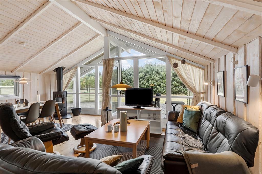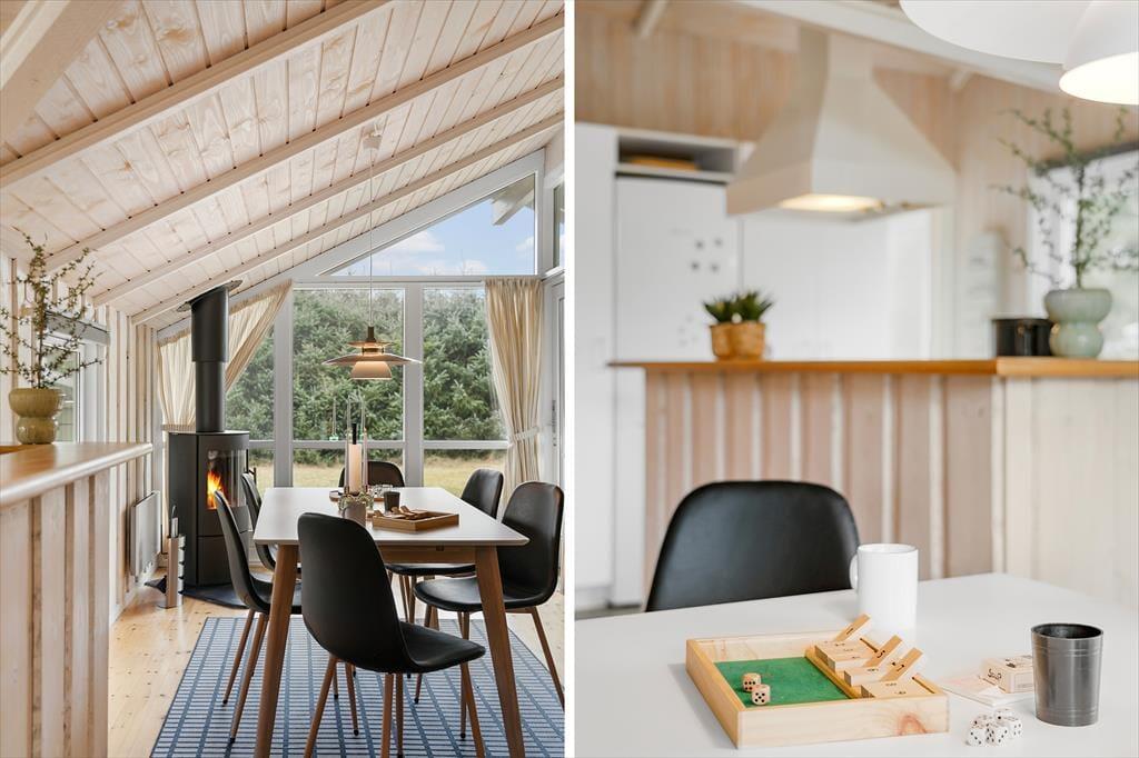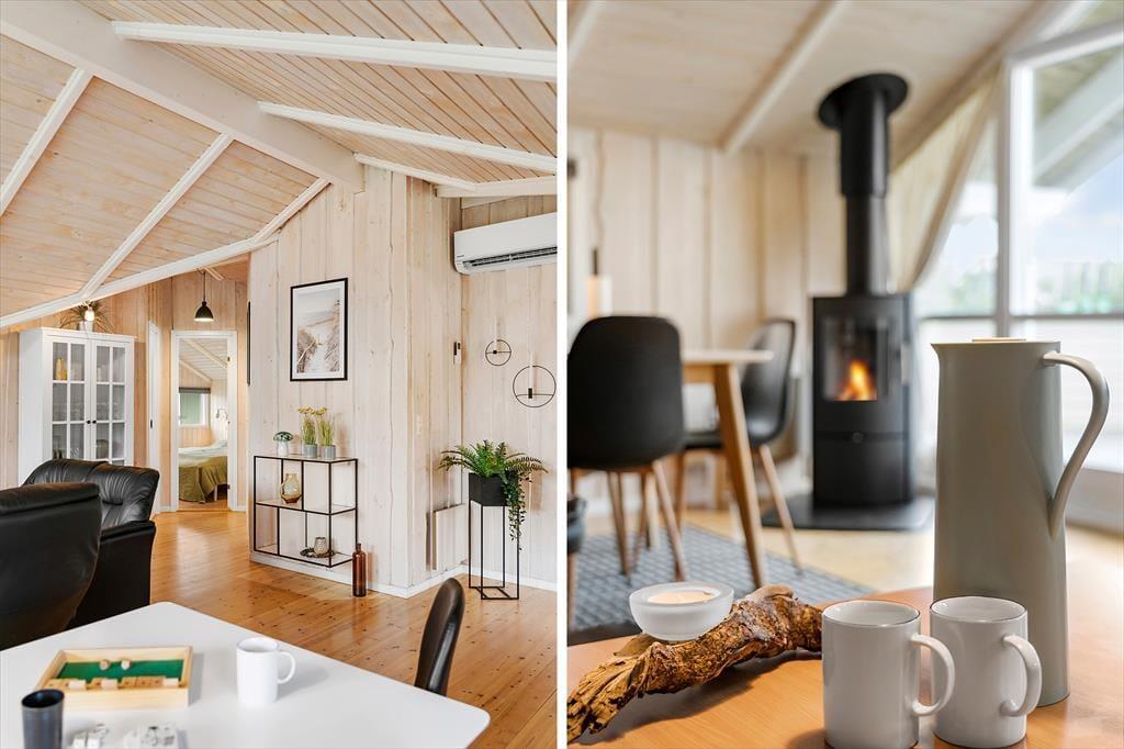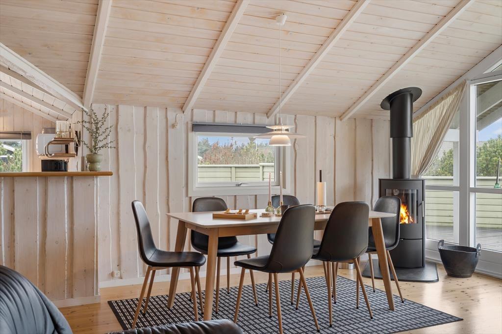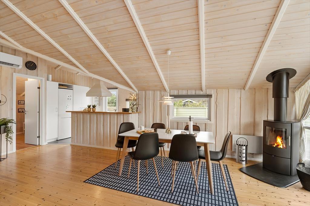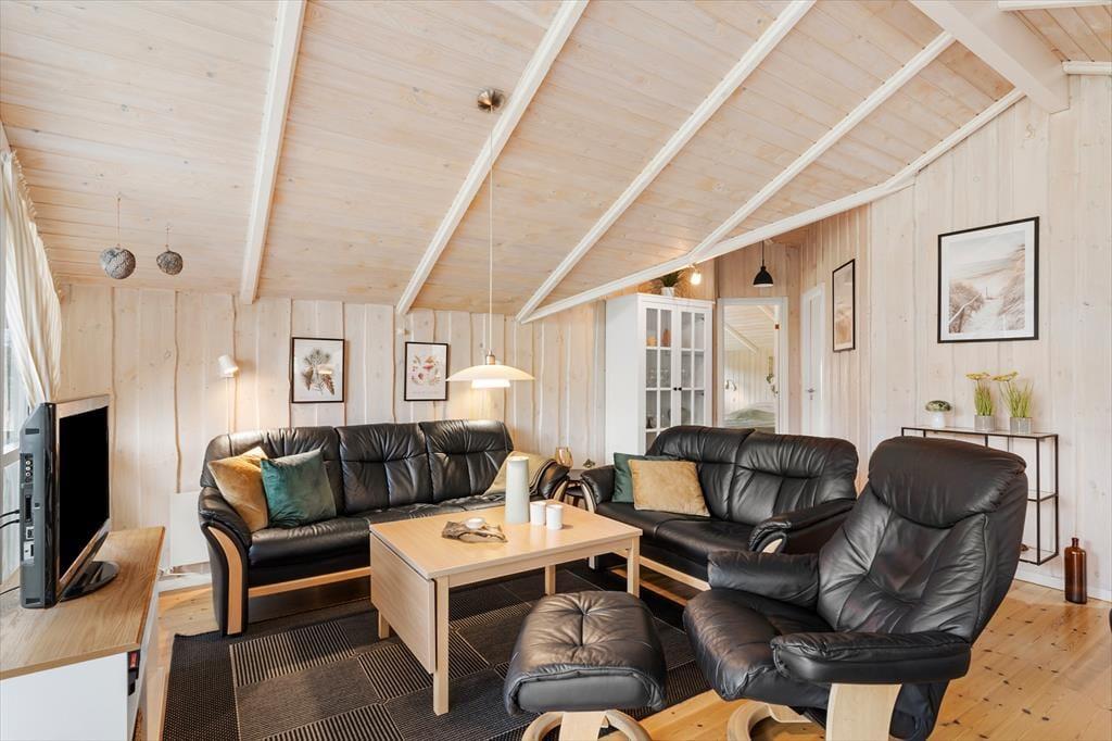 Når I træder ind i sommerhuset, mødes I af en lys og rummelig atmosfære med loft til kip og et dejligt lysindfald fra de store vinduer. Huset er indrettet i en moderne, nordisk stil, hvor køkken og stue er forbundet i et åbent opholdsrum, der indbyder til hyggeligt samvær og nærvær. I kan nyde synet af den omkringliggende natur gennem vinduerne, mens I slapper af i sofaen eller samles om et måltid ved spisebordet. Det veludstyrede køkken gør det nemt at tilberede feriens måltider, og med direkte adgang til stuen kan kokken nemt deltage i samtalerne og hyggen. Sommerhuset rummer desuden tre komfortable soveværelser, så her er god plads til, at hele familien kan finde sig til rette. Badeværelset byder på både spabad og sauna – den perfekte afslutning på en dag fuld af oplevelser i naturen.