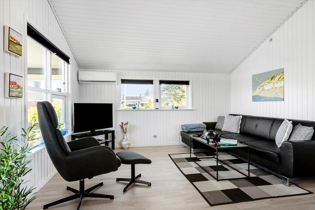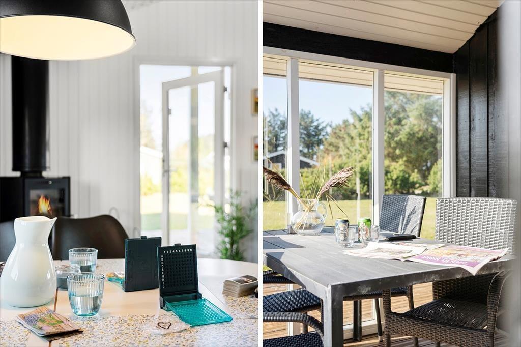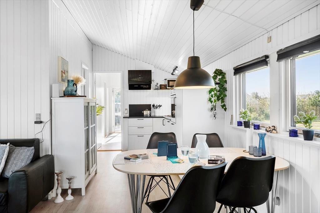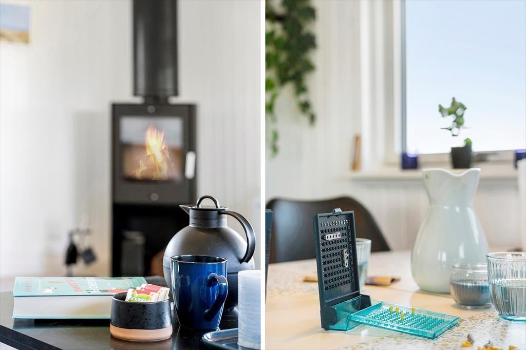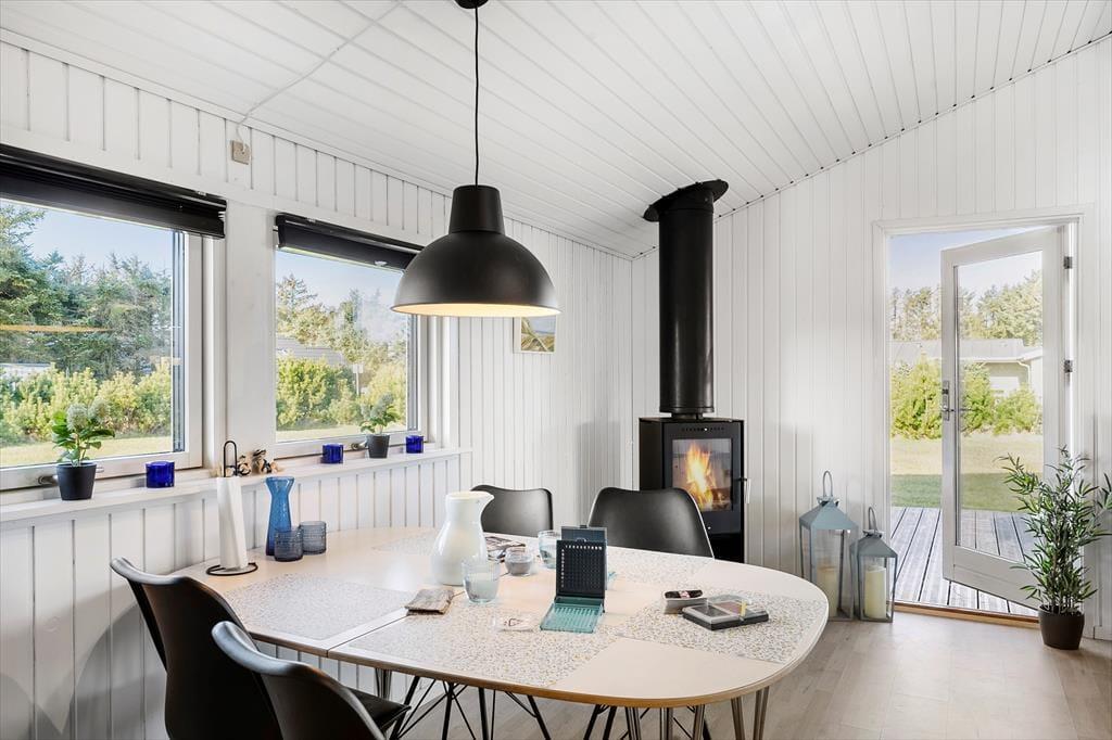 Indenfor mødes du af en lys og varm atmosfære, der straks indbyder til afslapning. Sommerhuset er hyggeligt indrettet med sans for detaljen og skabt til det gode samvær. Den åbne planløsning mellem køkken, spiseplads og stue gør det nemt at være sammen, selv når nogle laver mad, mens andre spiller spil eller nyder en stille stund i sofaen. I stuen er der brændeovn, som bidrager med både varme og hygge på kølige dage – lyden af knitrende ild og duften af træ giver en særlig stemning, når mørket falder på. De store vinduer lukker lyset ind og skaber en dejlig forbindelse til naturen udenfor, og fra stuen er der direkte adgang til terrassen, så det er let at lade inde- og udeliv smelte sammen.