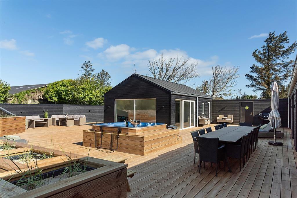 Udendørsarealerne ved sommerhuset er noget helt særligt. Den lukkede træterrasse breder sig over hele 350 m2 og bliver hurtigt omdrejningspunktet for jeres ophold. Her er masser af plads til både afslapning og leg – og takket være den lukkede udformning sikrer at børn kan færdes trygt. Start dagen med en stille kop kaffe i morgensolen, læg dig på en solseng med en god bog eller saml familien til grillmiddag under åben himmel, mens duften af sommer og grillmad breder sig i luften. Når mørket falder på, er det oplagt at runde dagen af med et dyp i det varme udendørs spabad. Uanset årstiden og vejret skaber terrassen og de mange udendørs faciliteter den perfekte ramme for ferieminder, der varer ved.