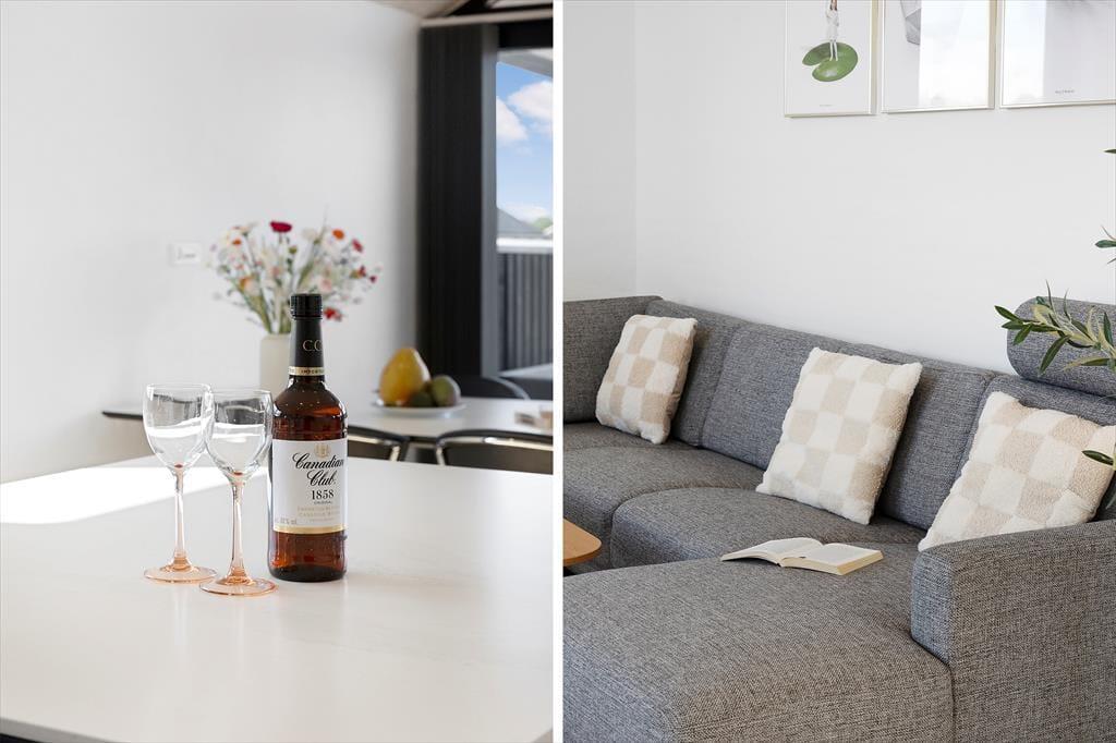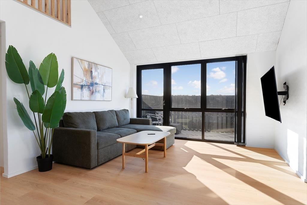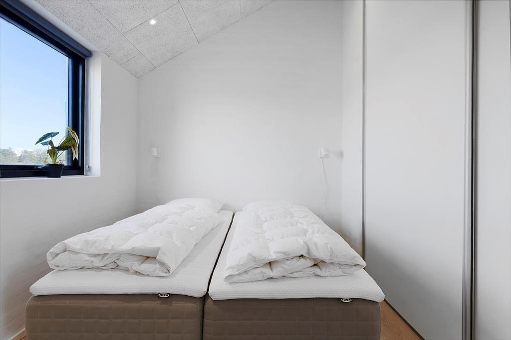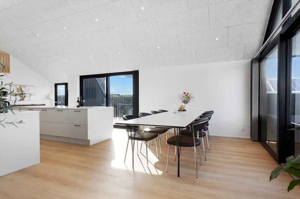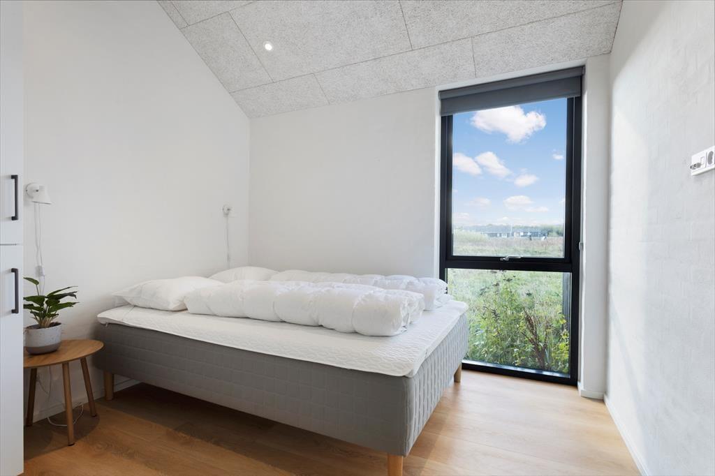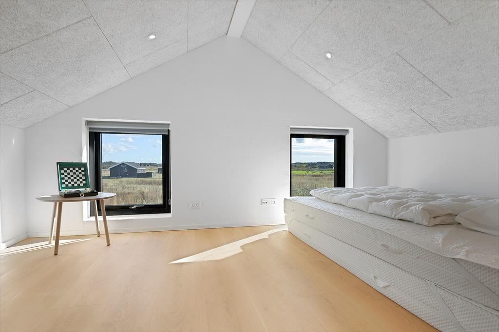 Det moderne sommerhus fra 2025 byder på lyse, åbne rum og en indretning, der skaber ro og rammerne for nærvær. Det centrale opholdsrum samler køkken og stue i ét, så du kan stå ved gryderne og stadig være en del af samtalen. Store vinduespartier lukker lyset og naturen ind og skaber en følelse af luft og frihed. Når dagen går på hæld, kan du forkæle dig selv med en tur i det varme spabad eller mærke varmen brede sig i kroppen i husets sauna. Det er den slags komfort, der gør det let at slappe helt af og finde ferieformen. Huset er rummeligt og velegnet til både store og små familier, og her er tænkt på, at alle skal føle sig hjemme.