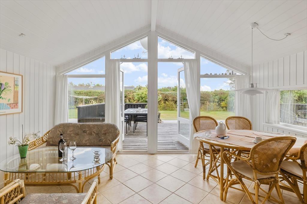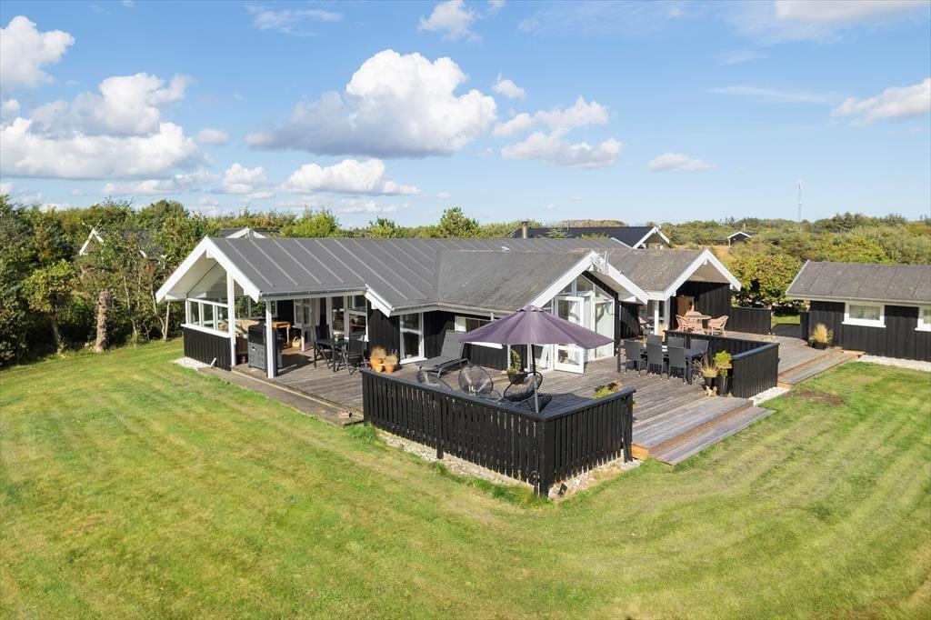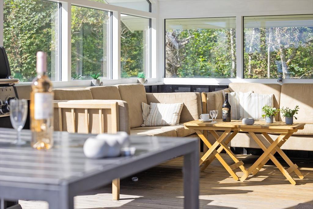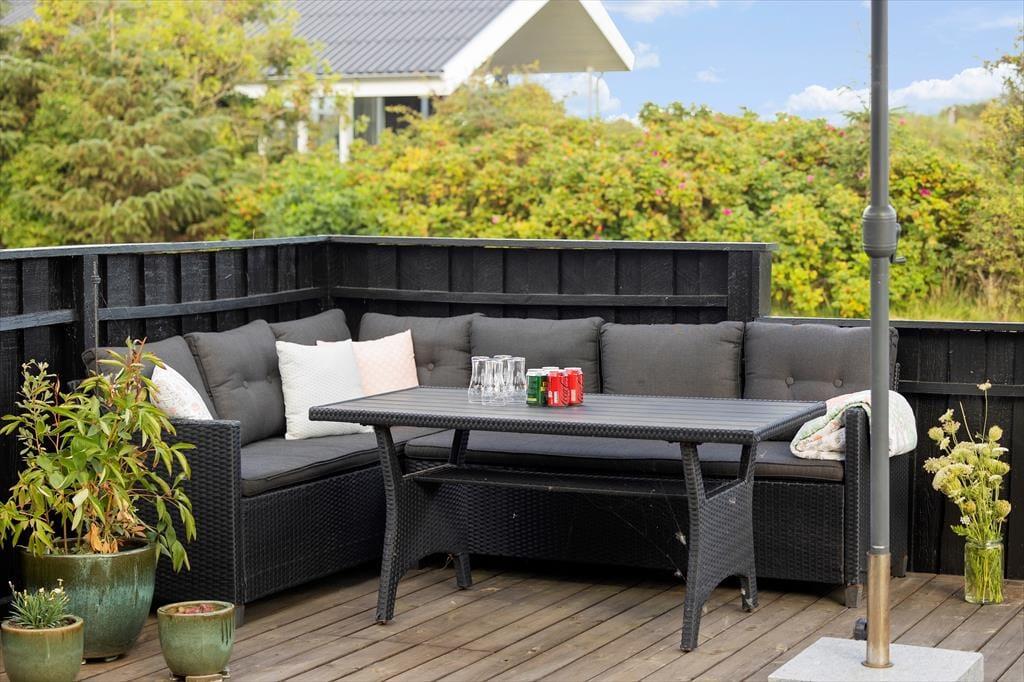Sommerhusets mange terrasser indbyder til ferieliv under åben himmel fra morgen til aften. Slå dig ned i en af de komfortable loungemøbler med en kop kaffe, mærk den friske havluft og lyt til fuglenes sang. På den store grund er der plads til, at børnene kan lege frit, mens de voksne finder en solplet eller et skyggefuldt hjørne alt efter humør. Fra udestuen kan du træde direkte ud på terrassen, hvor der er oplagt at nyde måltiderne i det fri. Som gæst har du også adgang til områdets fælleshus, hvor en indendørs pool, sauna, vaskemaskine og tørretumbler står til rådighed. For de mindste er legepladsen ved fælleshuset et sikkert hit.