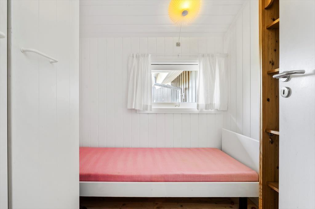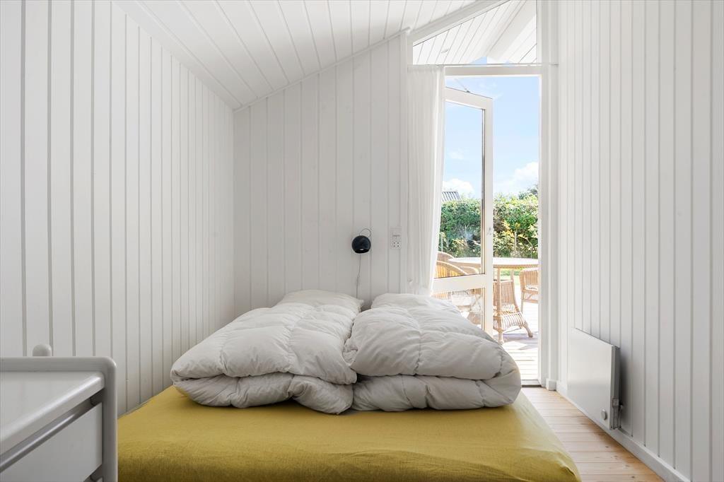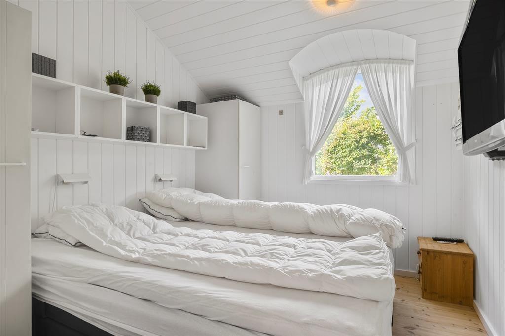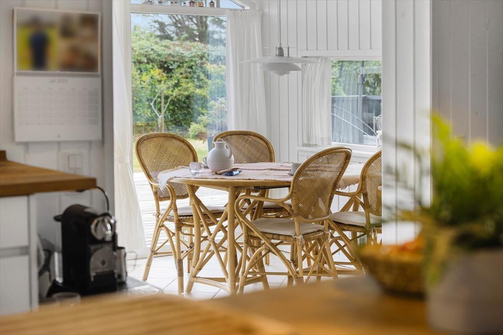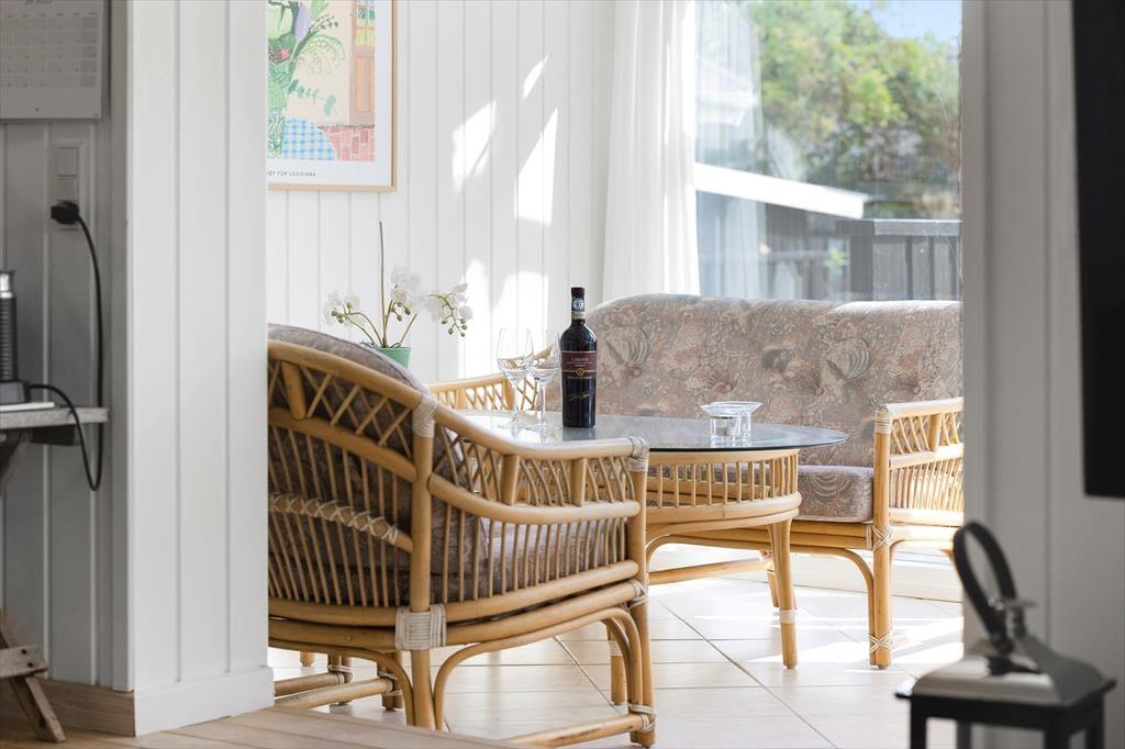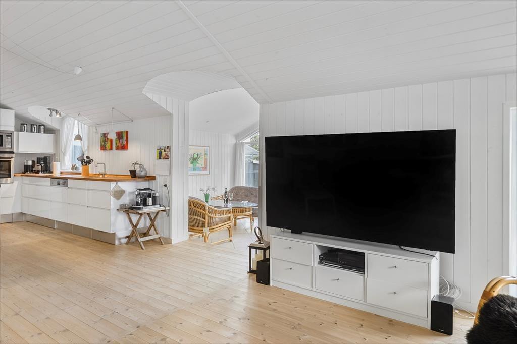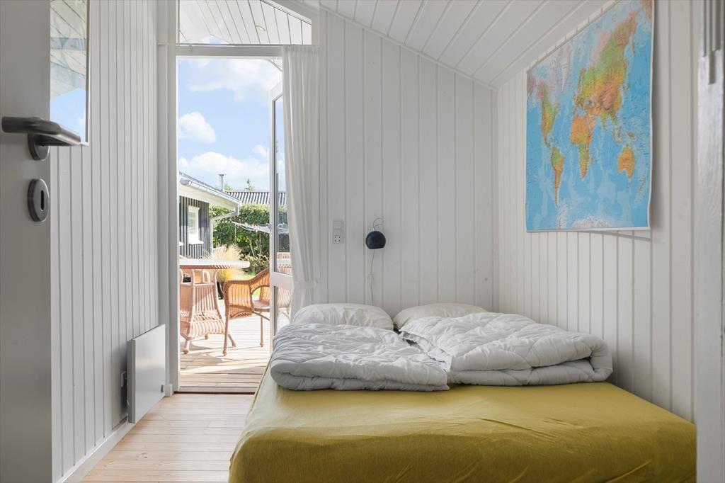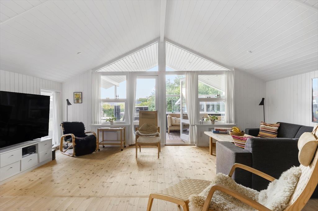 Sommerhuset er gennemtænkt indrettet, så lyset strømmer ind, og hver kvadratmeter udnyttes til fulde. De lyse rum giver en let og indbydende stemning, og fra to af soveværelserne kan du træde direkte ud på terrassen og starte dagen under åben himmel. Et af værelserne har endda en dobbeltseng med elevation, så komforten er helt i top, når det er tid til at slappe af. Køkken og stue er samlet i et åbent opholdsrum, hvor samtaler og samvær får lov at fylde, mens maden tilberedes. Herfra er der adgang til en hyggelig, lukket udestue, der forlænger sæsonen og giver mulighed for at nyde naturen – også på de køligere dage.