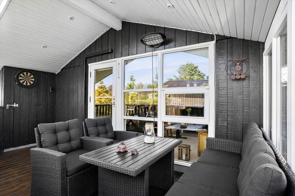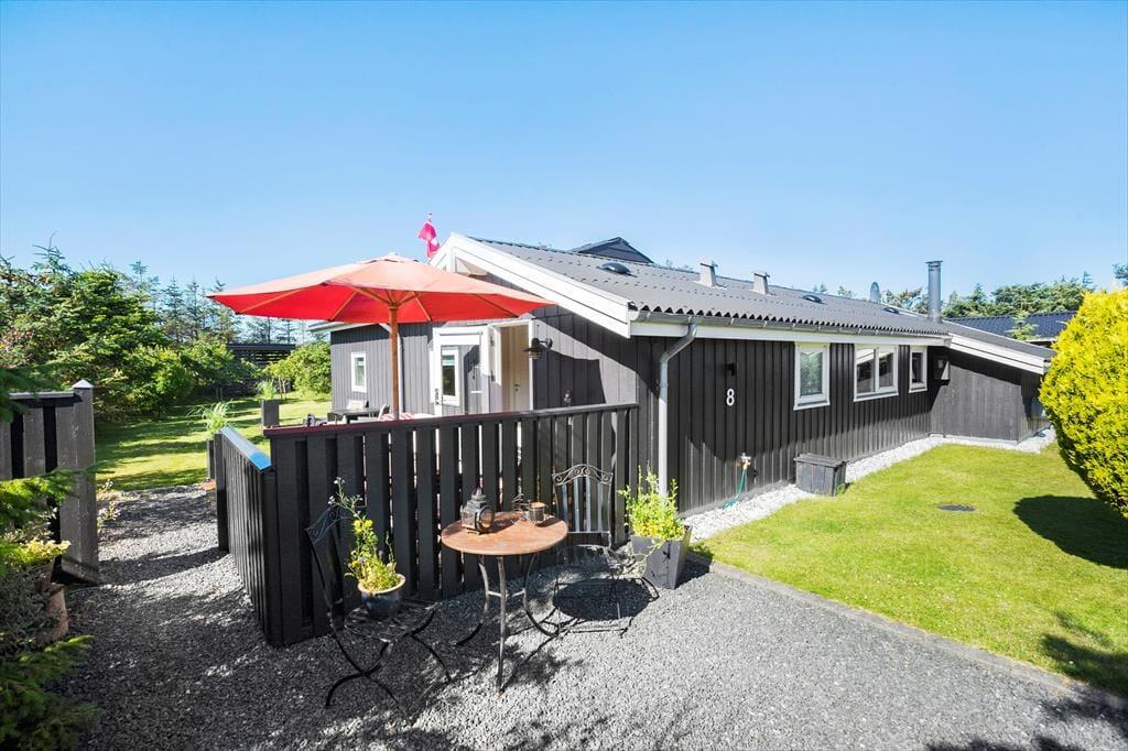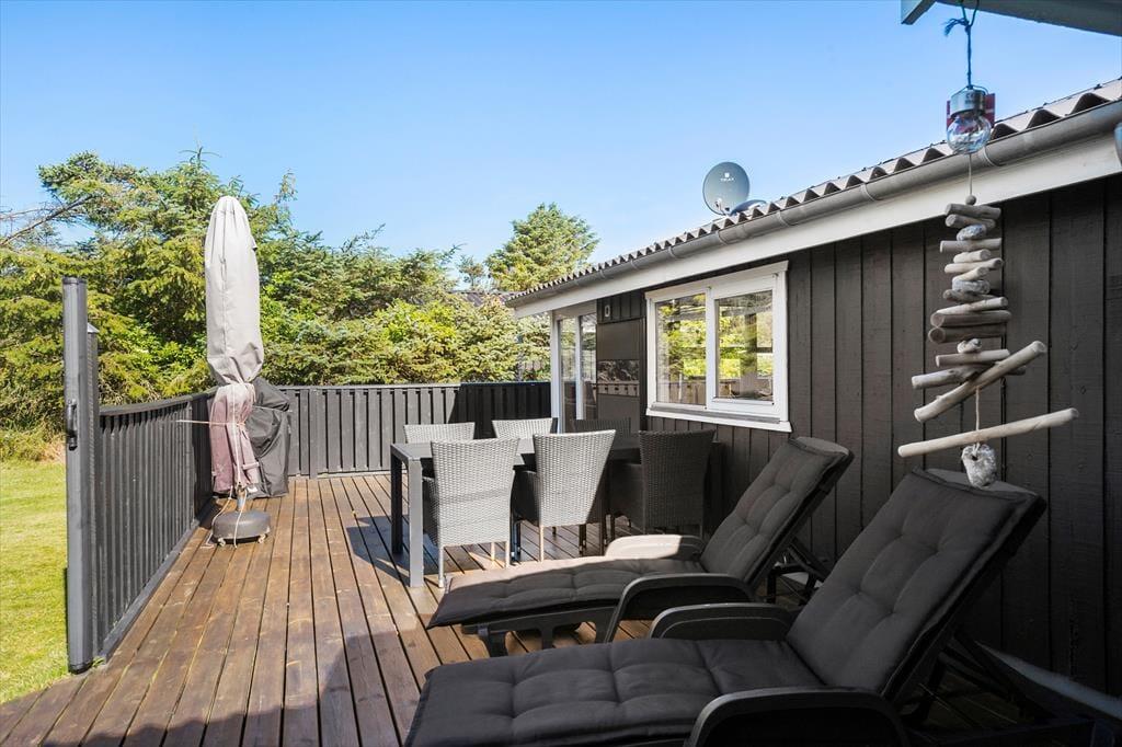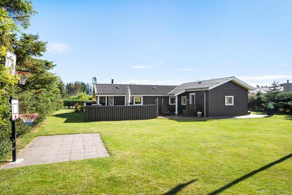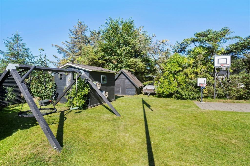 Når man har børn med på ferie, er det vigtigt med gode og brugbare udendørs faciliteter, og med legehus, gynge og basketballnet, opfylder dette sommerhus betingelserne til fulde. Det er også muligt at lege og spille bold på græsplænen, eller at tage en lur på liggestolene. Der er terrasser på flere sider af huset, mod vest også en overdækket del, som er ideel til de lange og lune sommeraftener, og grunden er fint afskærmet mod naboer og forbipasserende.