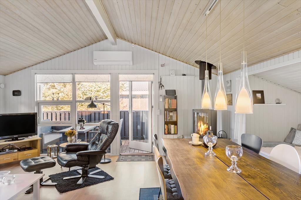 Et sommerhus med gennemført hyggelig indretning, hvor ejernes store kærlighed til stedet skinner klart igennem. Alt er velholdt og i fin kvalitet, så her kan man virkelig nyde sin ferie i de skønneste rammer. Køkkenet er af nyere dato og ligger ud-i-et med spisestue og stue, hvor der kan tændes op i brændeovnen, hvis vejret er køligt. Huset råder over tre soveværelser med dobbeltsenge, hvoraf de to er placeret i en moderne vinkeltilbygning ved entreen, og i stuen finder man en indbygget alkove, som kan bruges til hyggested eller som en ekstra soveplads. Overalt kan man gå på det gratis og trådløse internet, så det er en god ide at pakke pc eller tablets med til opholdet.
