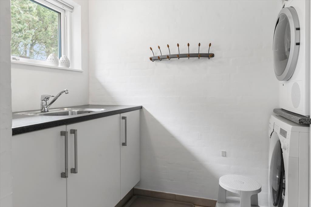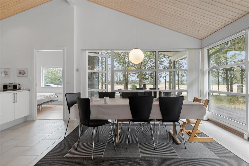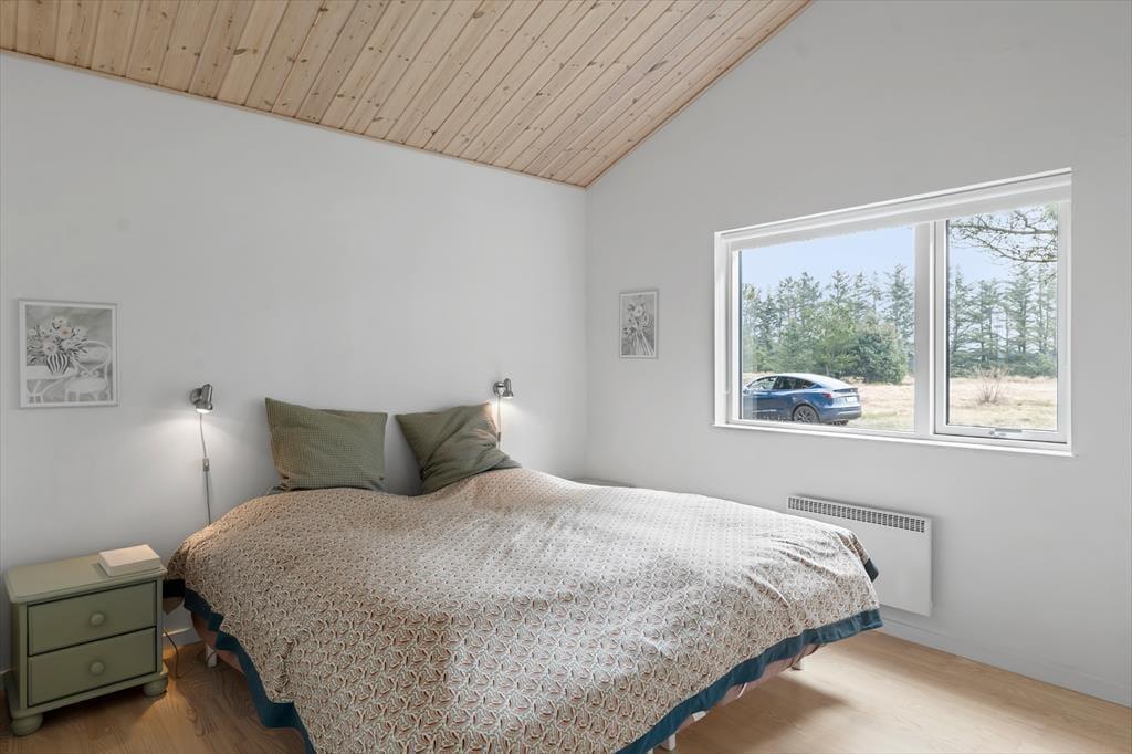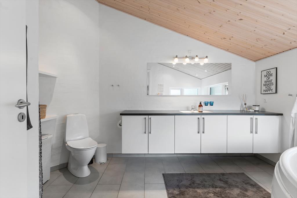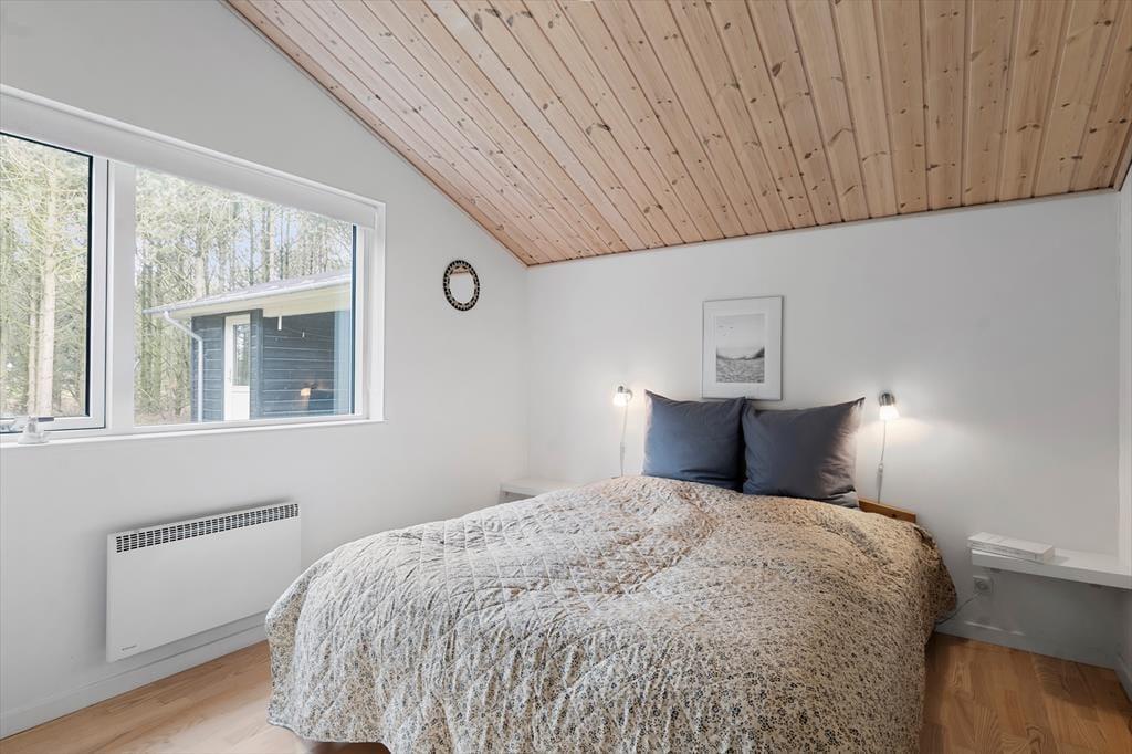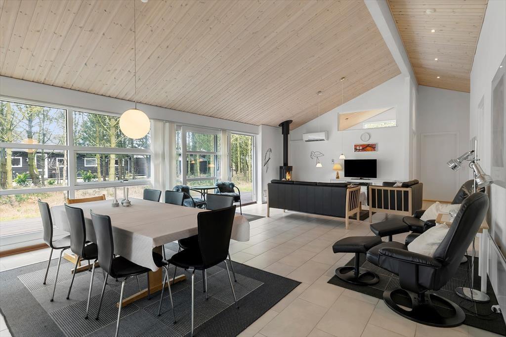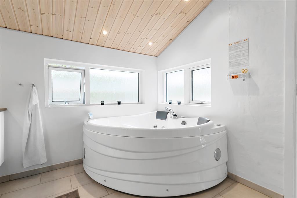 Sommerhuset er flot indrettet i smagfuld stil, med loft til kip og store vinduespartier er her lyst og venligt. Køkkenet er udstyret med alle tænkelige hjælpemidler og ligger i åben forbindelse med spiseafdelingen, så det er nemt både at servere maden og rydde op igen. I stuen er flere hyggekroge med sofaer og lænestole, og med en dejlig udsigt over grunden. De tre værelser er alle med dobbeltsenge og skabsplads, og de to badeværelser er begge med bruser og varme i gulvet. Det ene har desuden et spabad med plads til to personer. Sommerhuset egner sig fint til familier med små børn. Her er nemlig både seng og stol til de mindste.