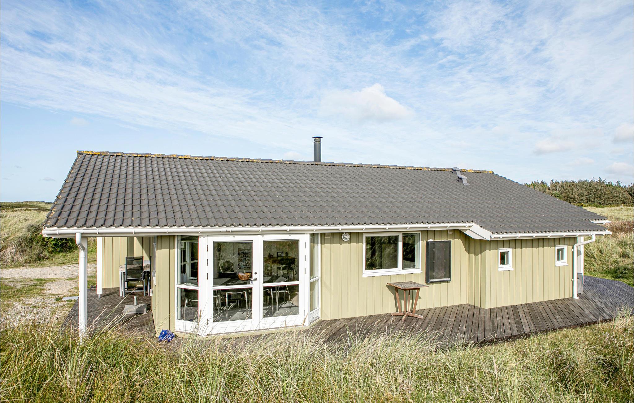 I det naturskønne Grønhøj, som ligger mellem de to eftertragtede badebyer Løkken og Blokhus, finder I dette flotte luksushus. Fra entréen kommer I ind i køkkenafdelingen, der ligger i åben forbindelse med spiseafdelingen og opholdsstuen. Stuens store vinduespartier giver masser af lys i stuen og ikke mindst mulighed for at nyde den dejlige udsigt i fulde drag. I stuen og soveværelserne er der trægulve, mens de resterende rum har klinkegulve. En skøn, stor træterrasse omgiver størstedelen af huset. Fra en bakketop på grunden har I en flot panoramaudsigt over klitter og hav.