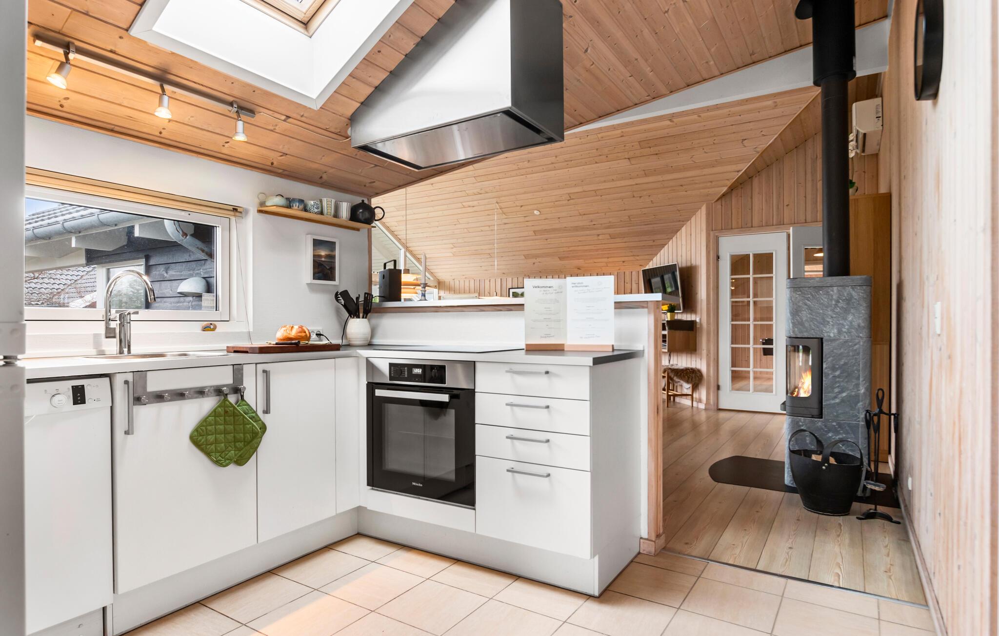 Dette indbydende sommerhus ved Grønhøj Strand ligger i kort afstand til de populære feriemål Løkken og Blokhus. Her får I et godt udgangspunkt for at nyde den betagende natur og helt særlige atmosfære, som hersker på den nordjyske vestkyst. Læg hverdagen bag jer og glæd jer til en afslappende pause i det rummelige hus, hvor der er plads til to familier. Huset emmer af hygge, ro og feriestemning. Læn jer godt tilbage i de komfortable sofaer, nyd dagens måltider ved det lange spisebord og glæd jer over varmen fra ilden i den knitrende brændeovn, når I vender hjem fra en frisk udflugt.