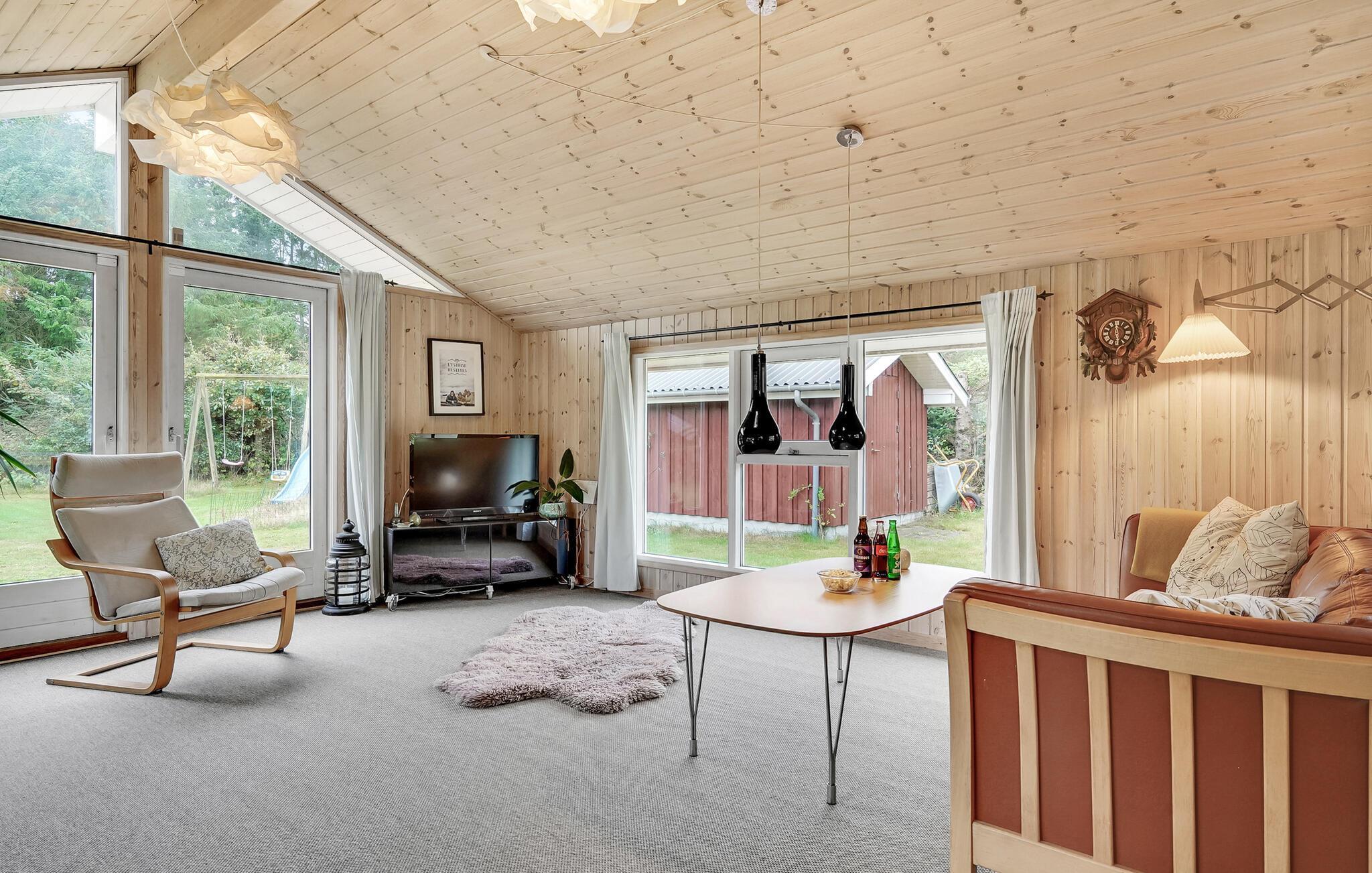 Dette hyggelige hus oser af klassisk sommerhus-idyl. Med sin lyse træbeklædning indvendigt samt store vinduer, fremstår huset rummeligt og åbent. Huset har i '20/'21 gennemgået en renovering så her alle de faciliteter I skal bruge til en skøn ferie for hele familien. Huset har blandt andet fået varmepumpe, så I let kan justere temperaturen. Udendørs finder I en stor overdækket terrasse, der indbyder til at nyde de lange sommeraftener i loungemøblerne med et godt glas vin.