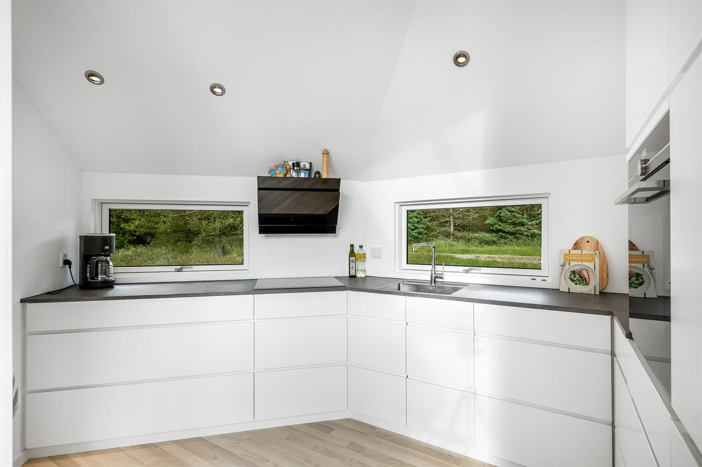 Køkkenet er udstyret med 1 køleskab. Der er 4 induktionskogeplader, varmluftovn, mikrobølgeovn samt opvaskemaskine Der er gulvvarme i køkkenet.