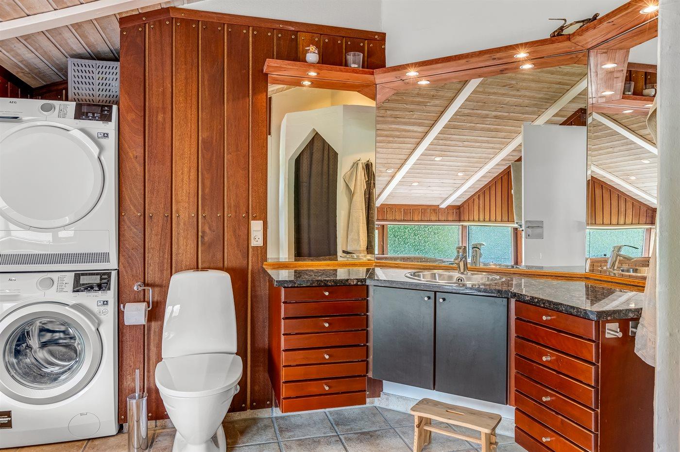 Huset har også 2 badeværelser begge med toilet, bruser og gulvvarme. I det store wellness-badeværelse er der desuden en spa med plads til 4 personer og adgang til en 3 personers sauna.
