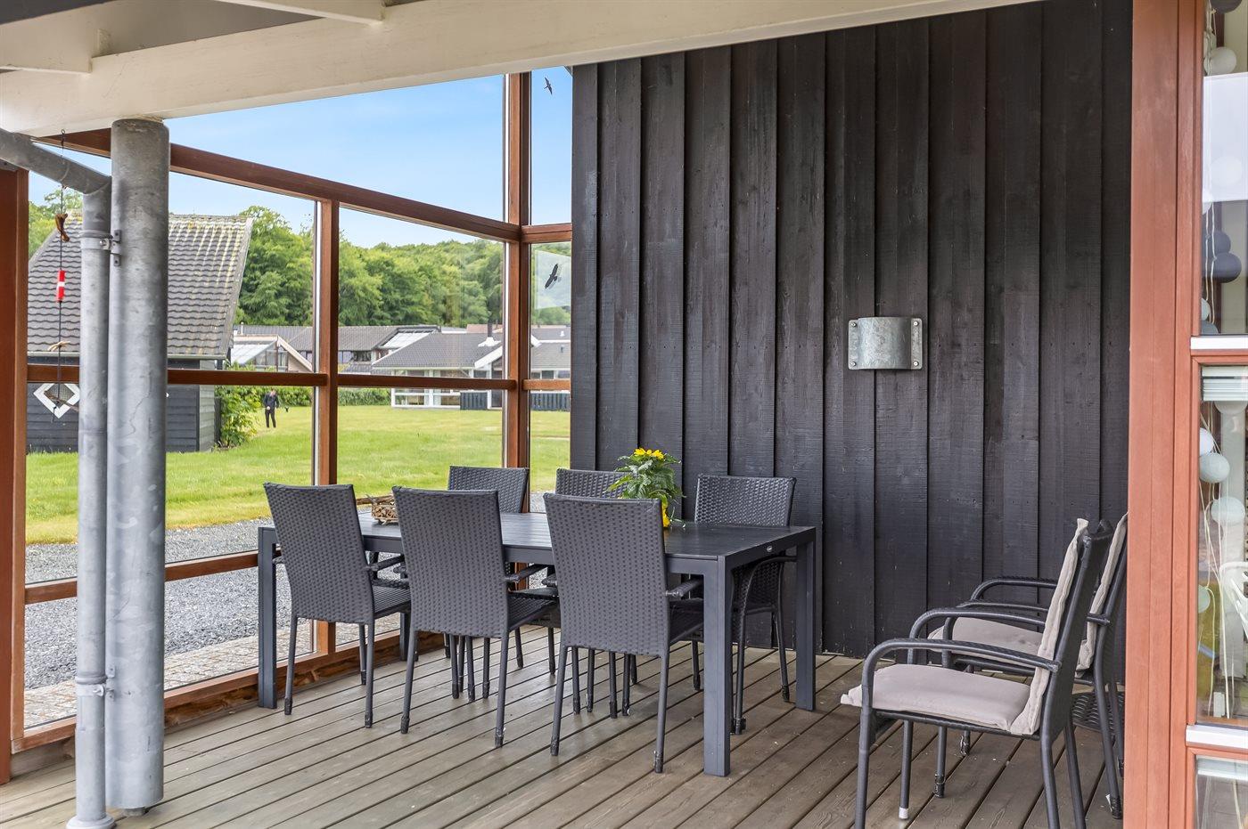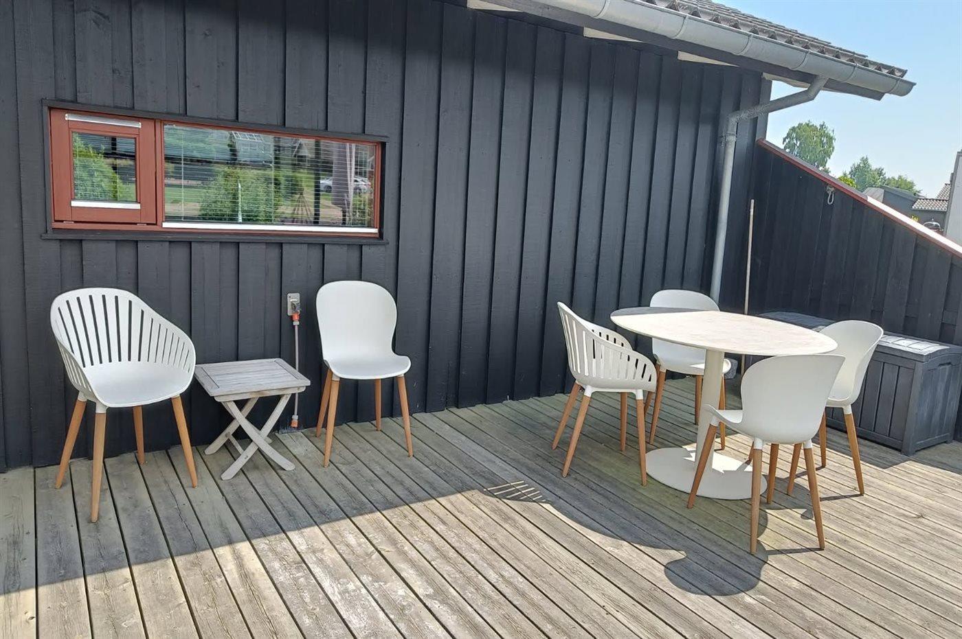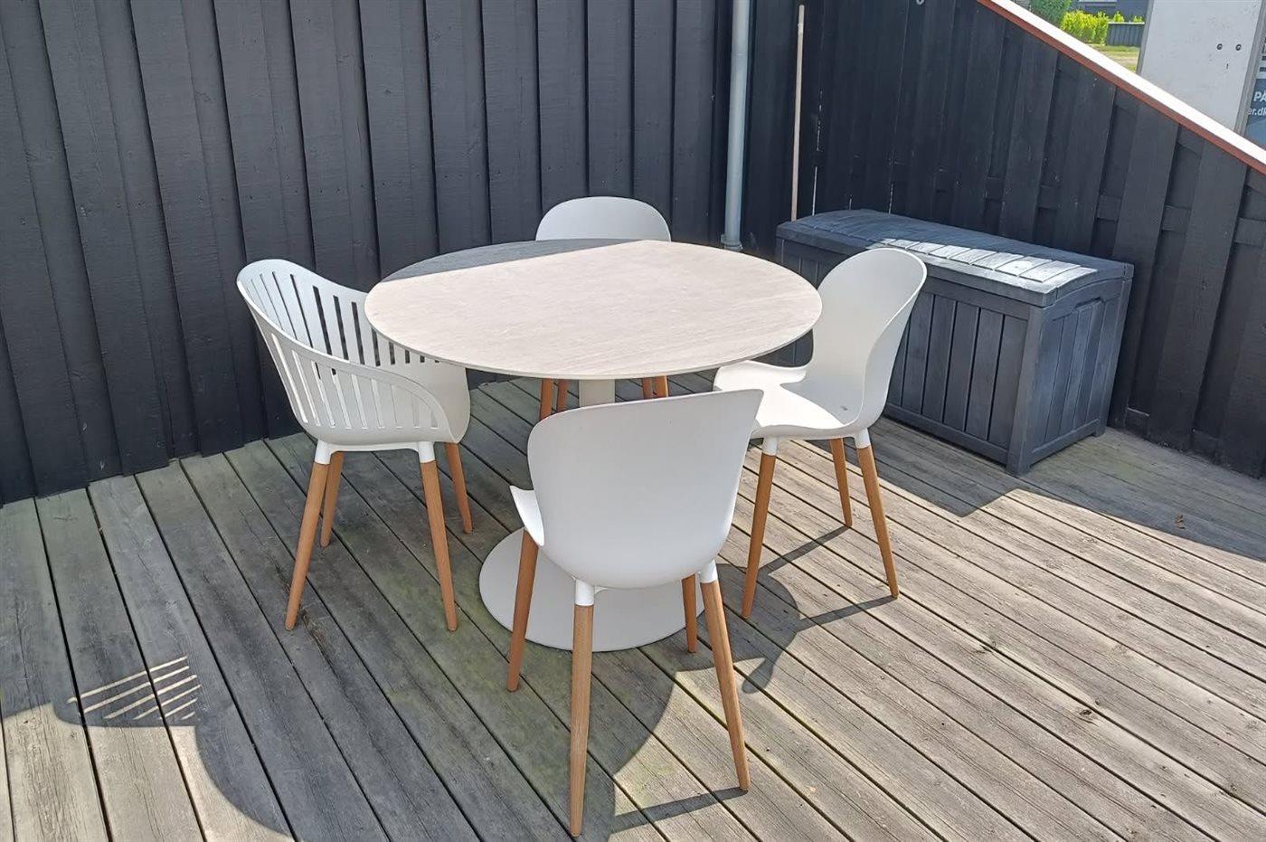 Udenfor er der over 80 m2 terrasse, heraf 10 m2 er overdækket. Der er havemøbler både i den overdækkede terrasse og på terrassen der vender ud mod skoven. Desuden er der 2 dækstole, som kan flyttes hen, hvor man ønsker at nyde solen. Hynder til havestolene er i hyndeboksen.