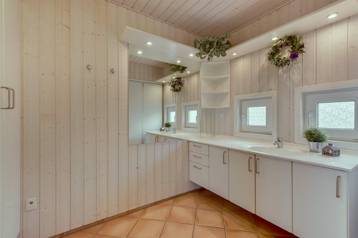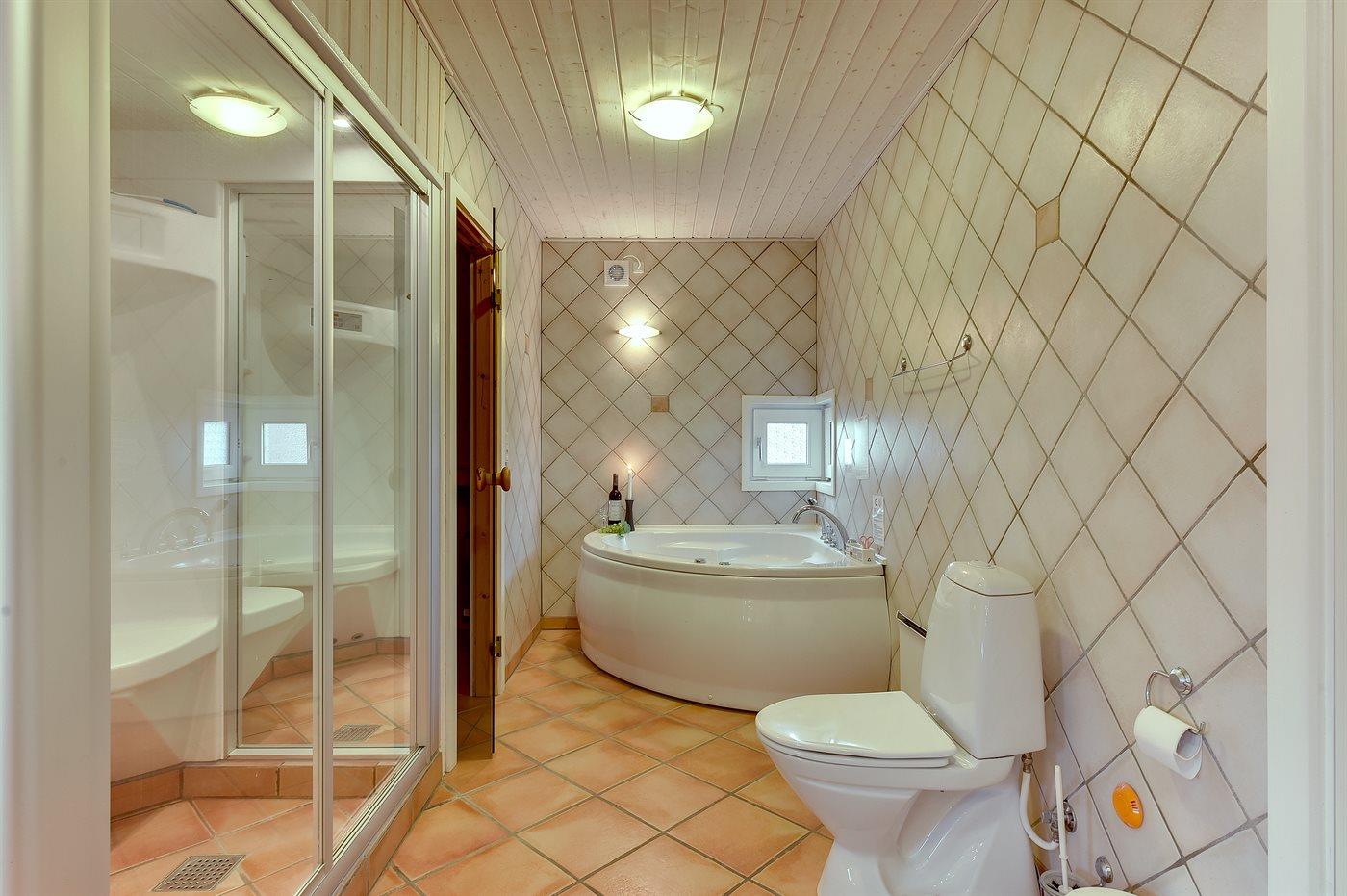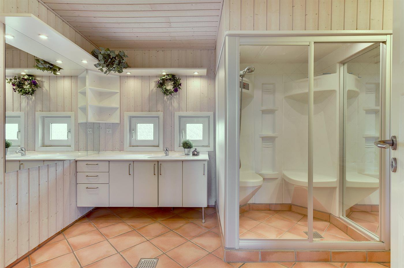 Der er 2 badeværelser med bruseniche og 2 toiletter. Der er gulvvarme på 2 badeværelser. Dampkabine. I saunaen er der mulighed for afslapning.