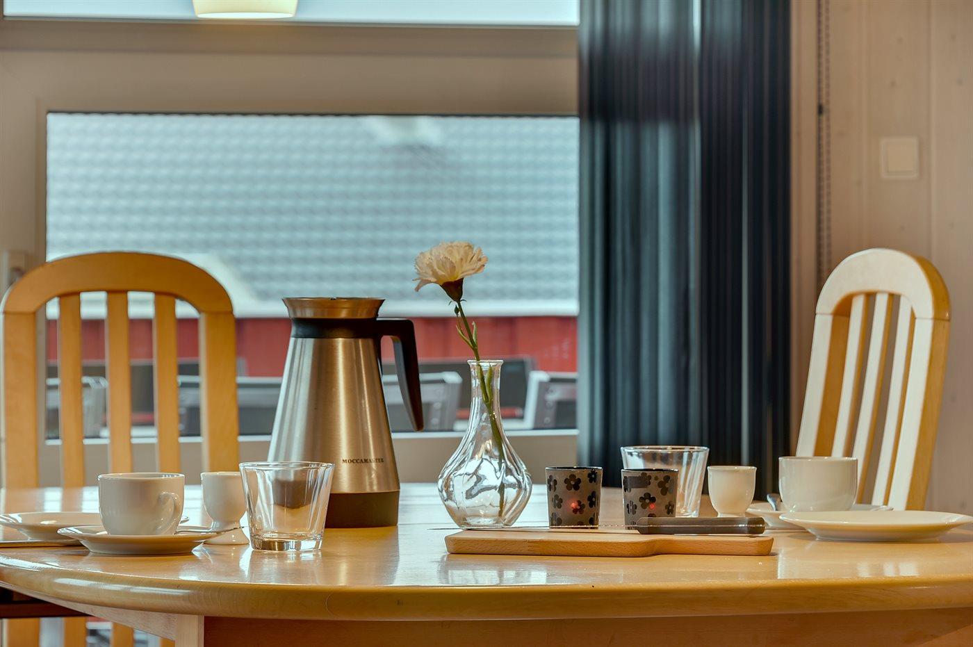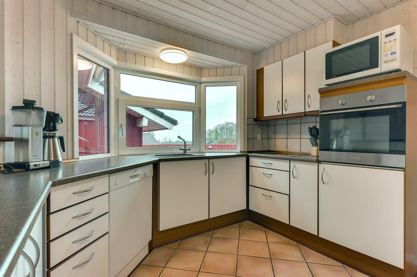 Køkkenet er udstyret med 1 køleskab. Der er 4 keramiske kogeplader, varmluftovn, mikrobølgeovn samt opvaskemaskine.