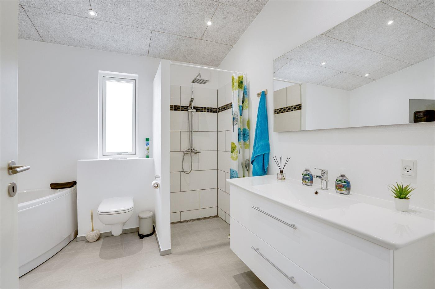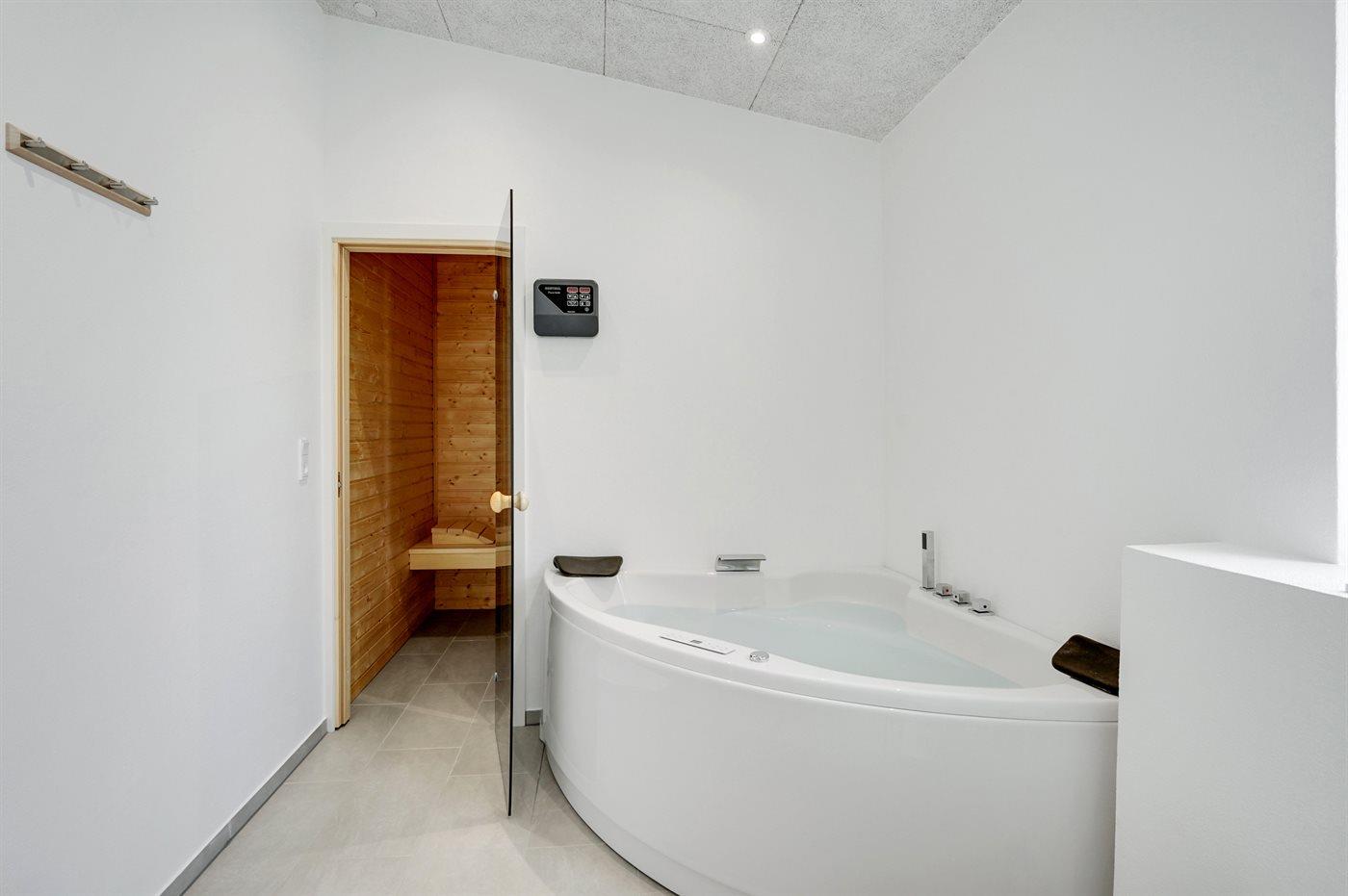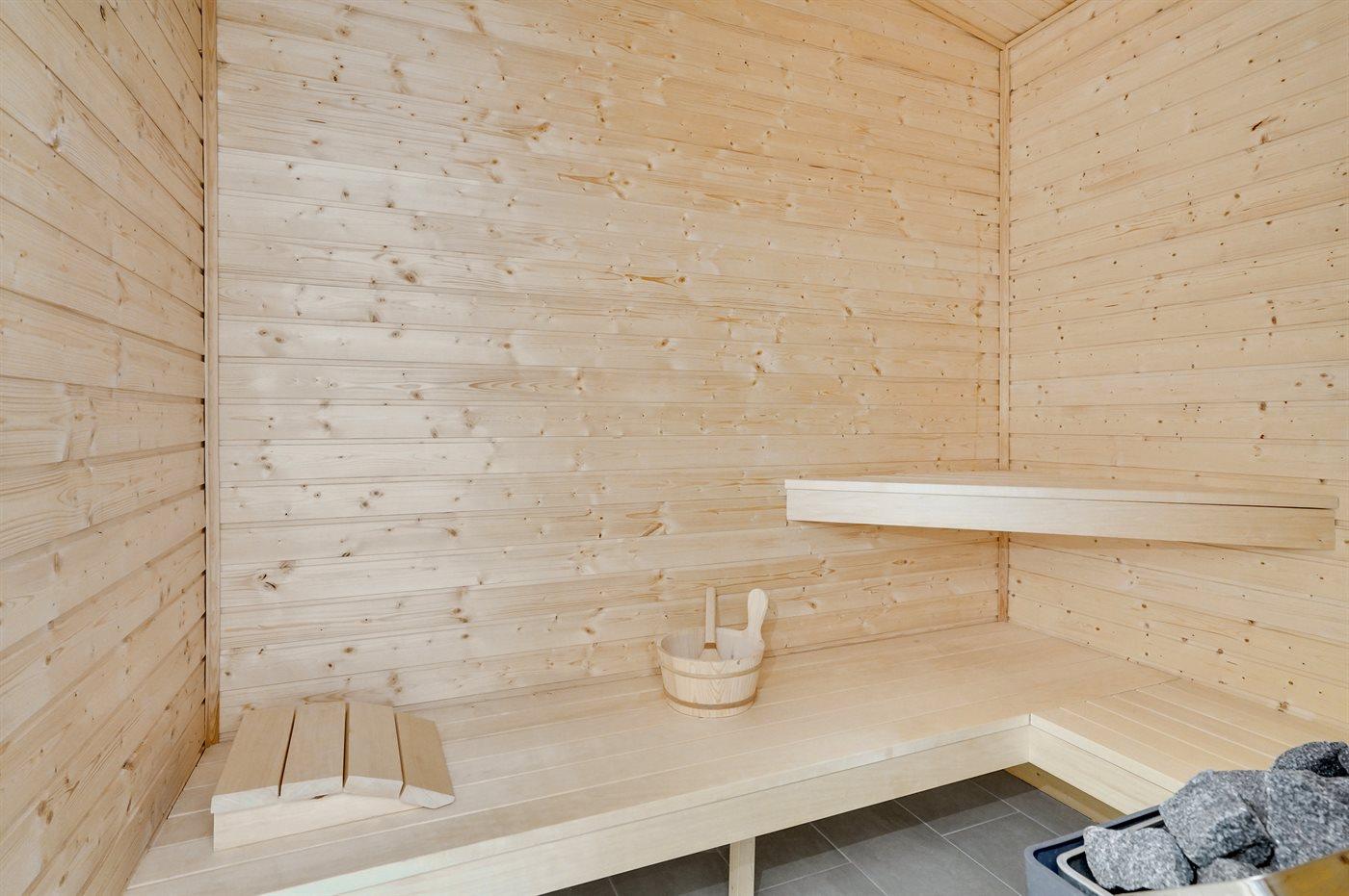 Der er 2 badeværelser med bruseniche og 2 toiletter. Der er gulvvarme på 2 badeværelser. I saunaen er der mulighed for afslapning.