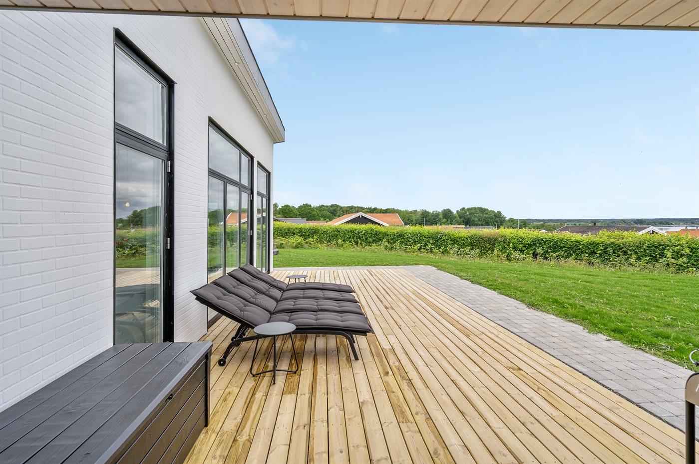 Ferieboligen er beliggende på en 900 m² stor havegrund. Der er 500 m til havet. Nærmeste forretning er beliggende i en afstand af 4000 m. Der er en golfbane i en afstand af 16000 m. Desuden er der 30 m² overdækket terrasse. Til ferieboligen hører åbent terrasseareal. Desuden er der overdækket terrasse. Der er redskabsrum. Trampolin. Fodboldmål. Grill til rådighed. Parkering ved ferieboligen.
