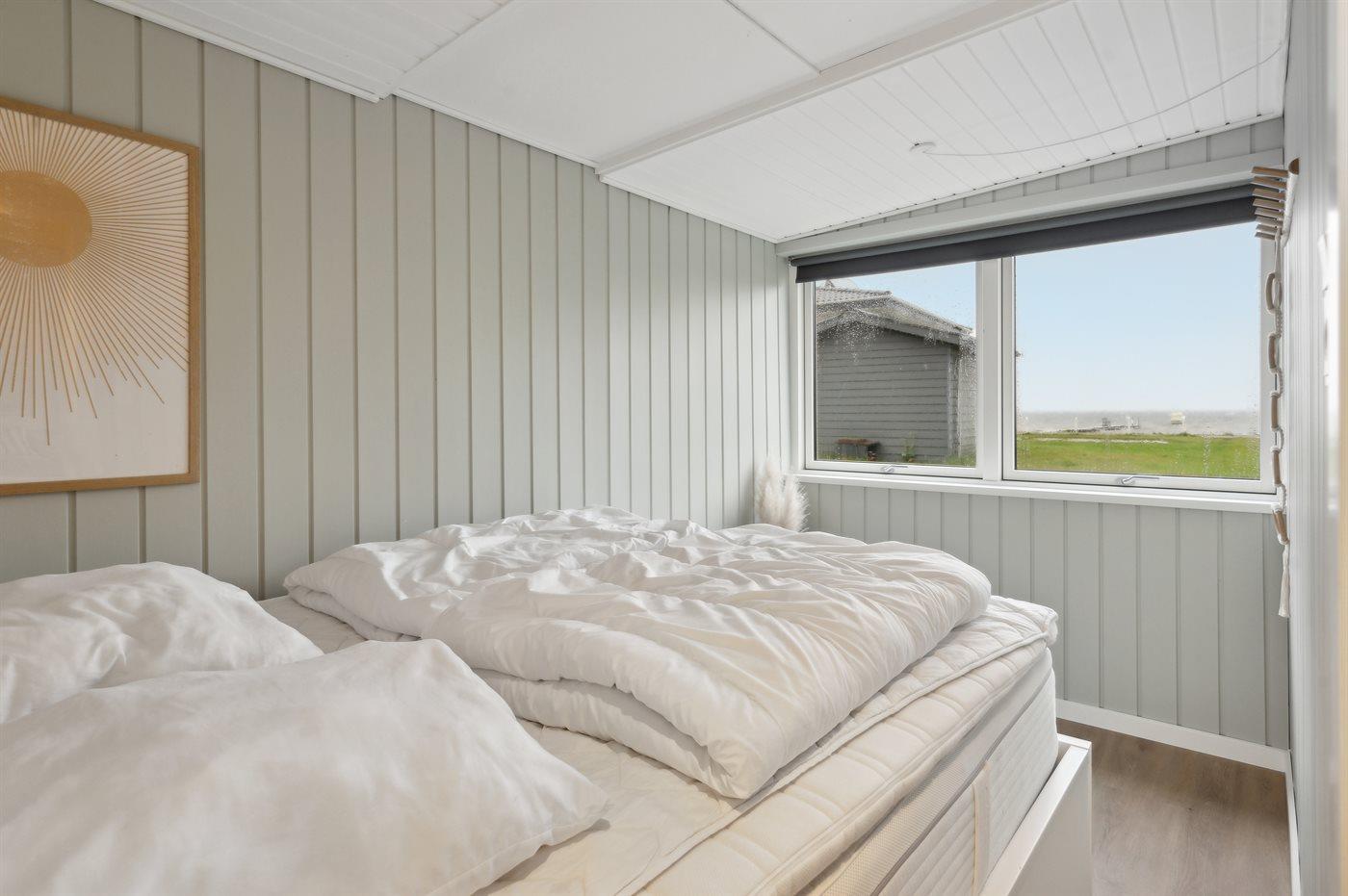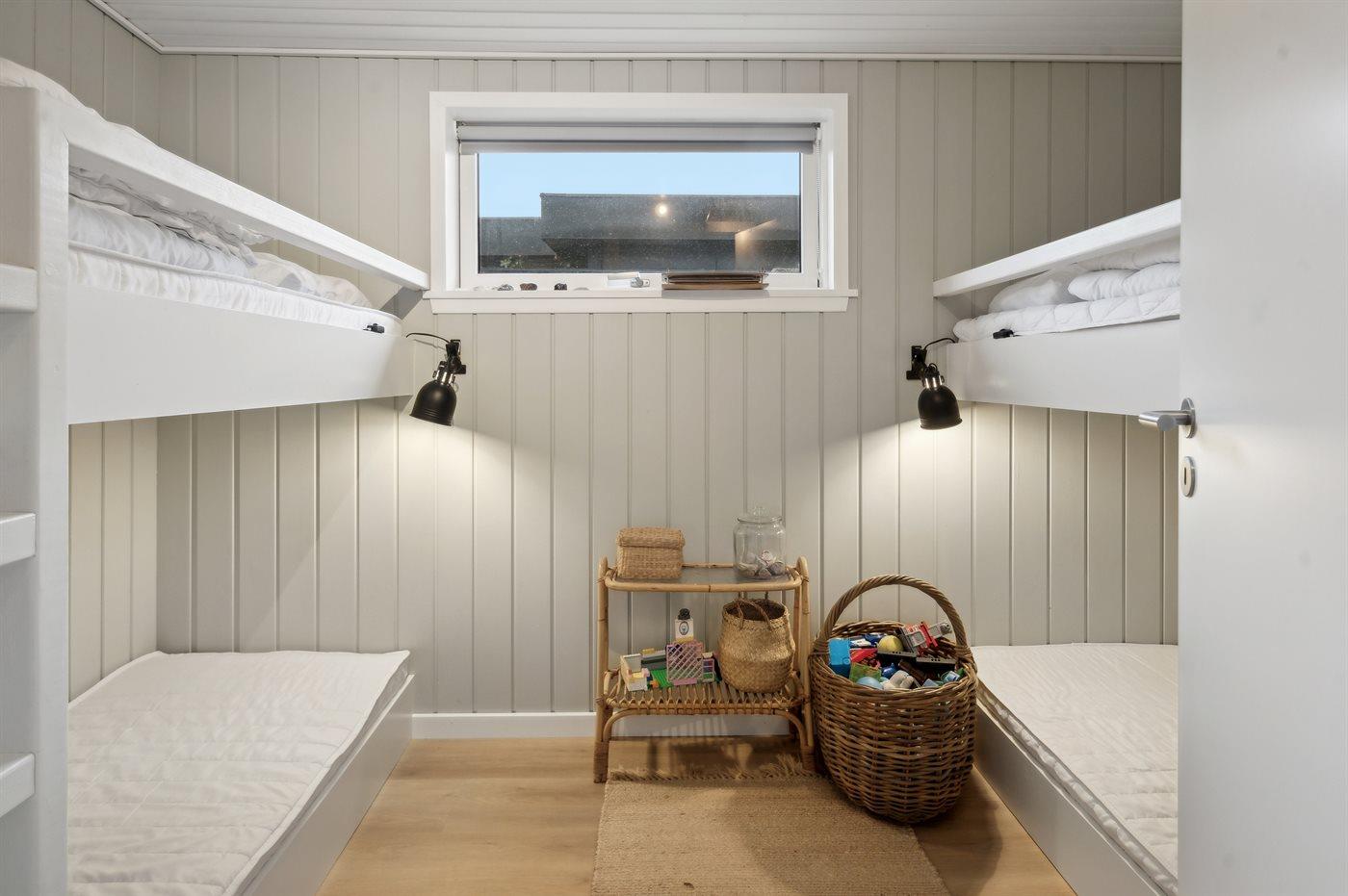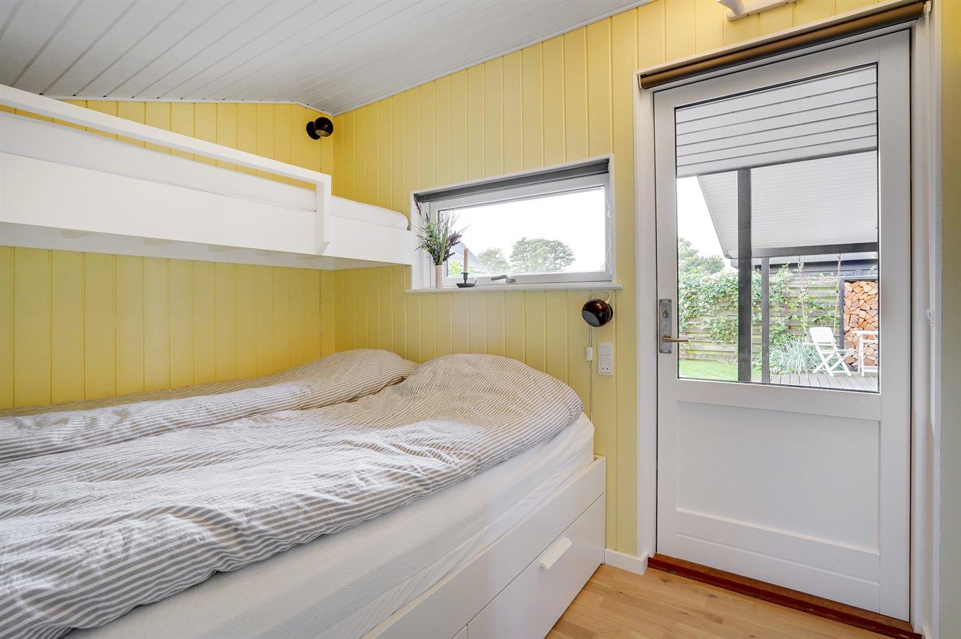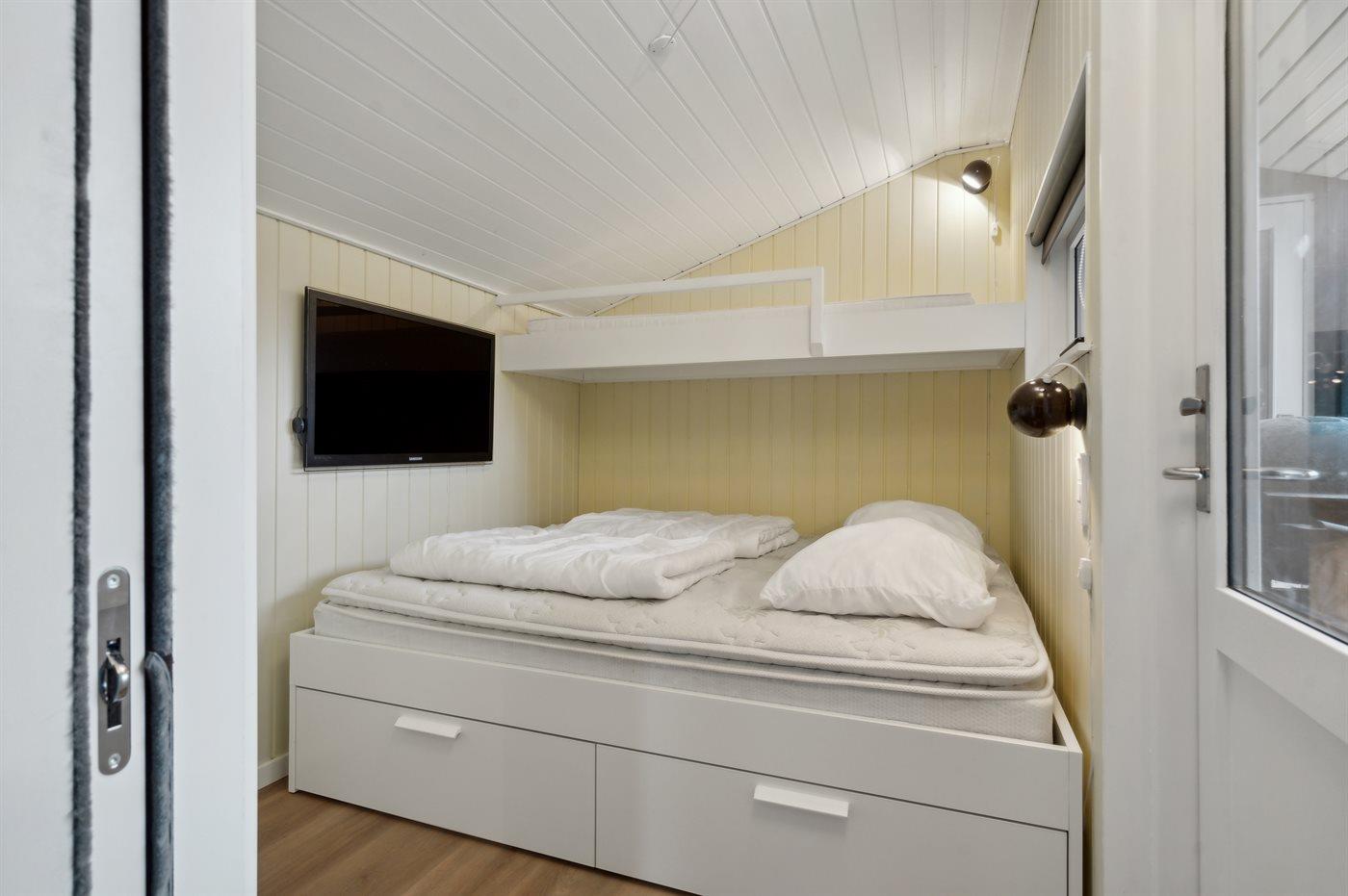 Der er i alt 3 soveværelser. Sovepladserne fordeler sig på: 4 sovepladser i dobbeltsenge. 2 sovepladser i køjeseng. Derudover er der 1 stk. barneseng.