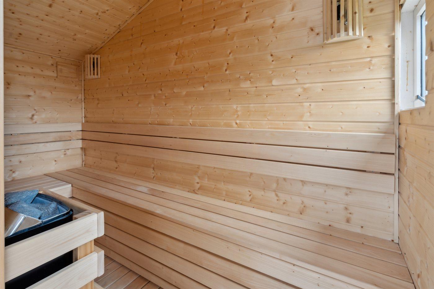 Der er 1 badeværelse med bruseniche og 1 toilet. I saunaen er der mulighed for afslapning.