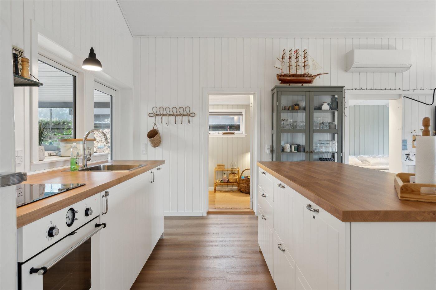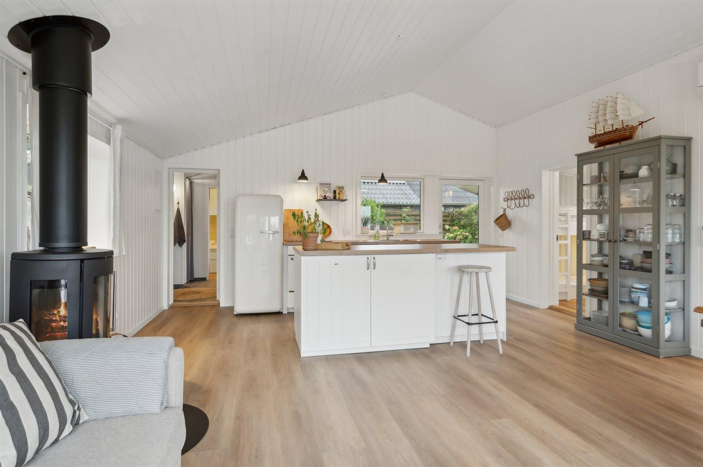 Køkkenet er udstyret med 1 køleskab. Der er 4 induktionskogeplader, varmluftovn samt opvaskemaskine.