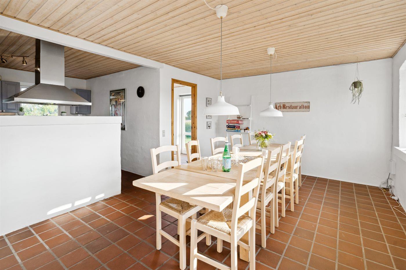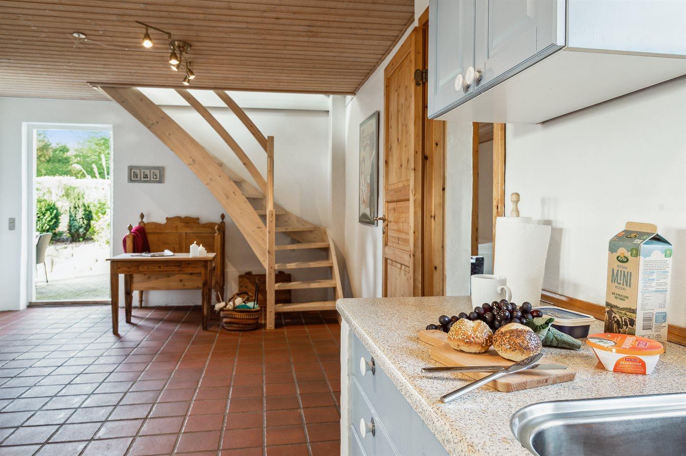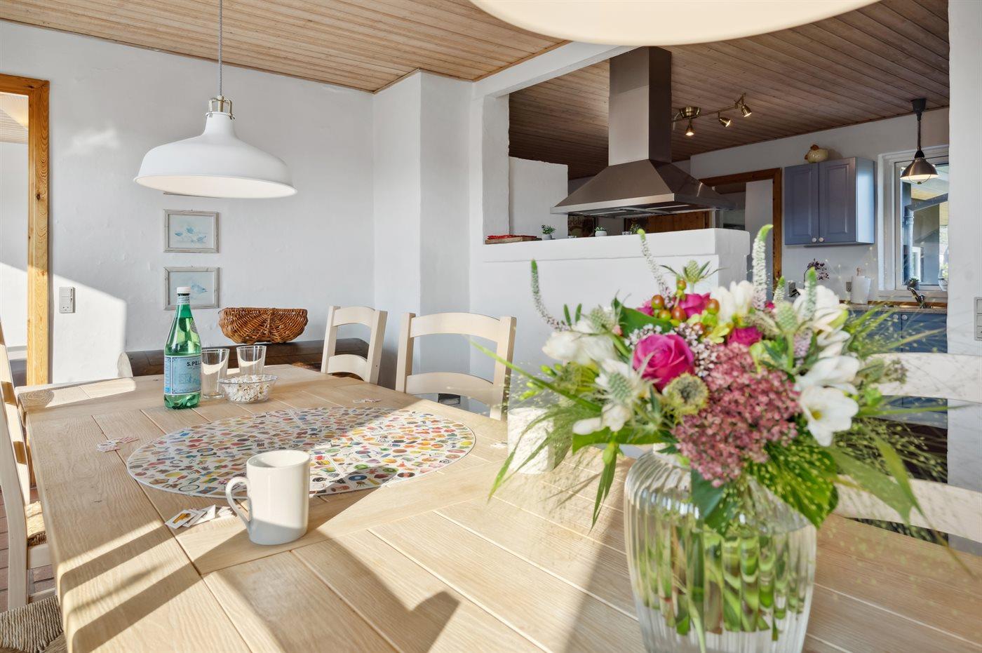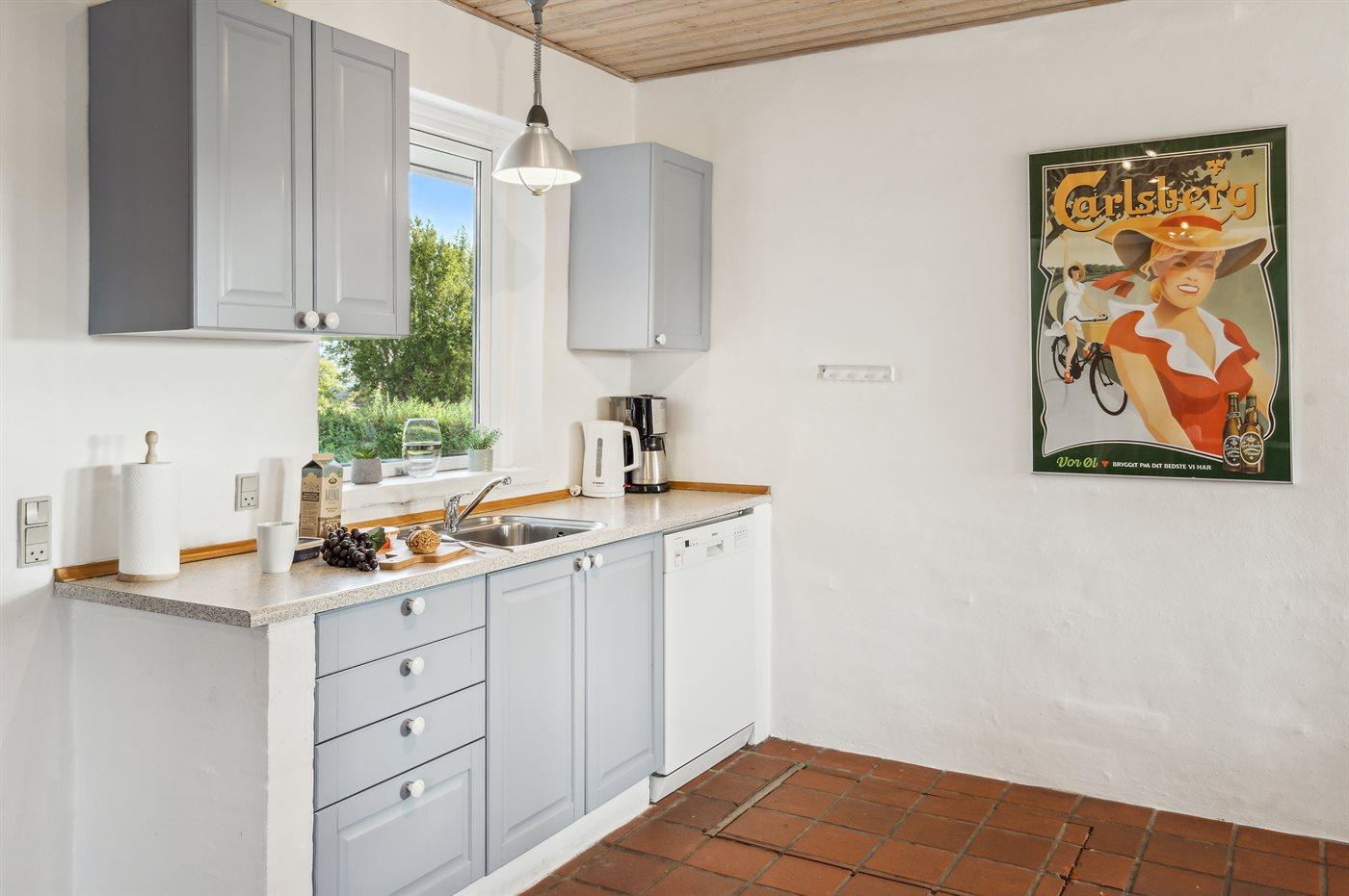 Køkkenet er udstyret med 1 køleskab. Der er 4 keramiske kogeplader, varmluftovn samt opvaskemaskine.