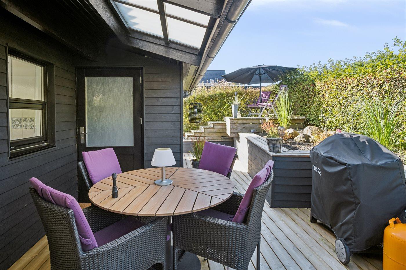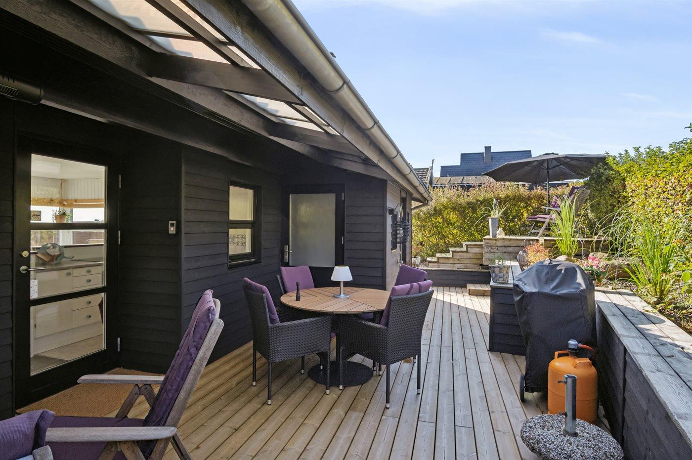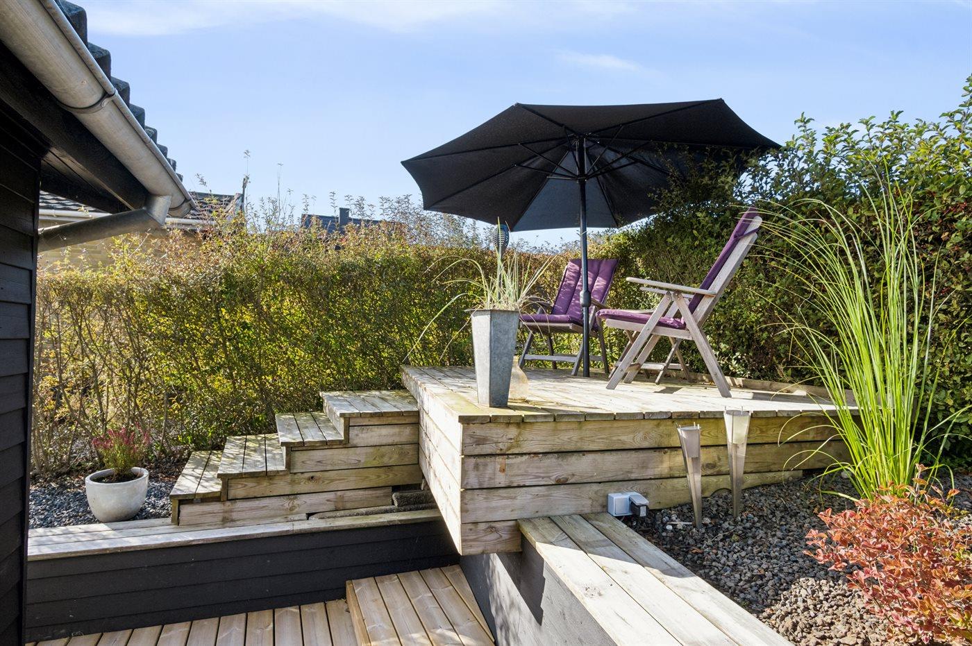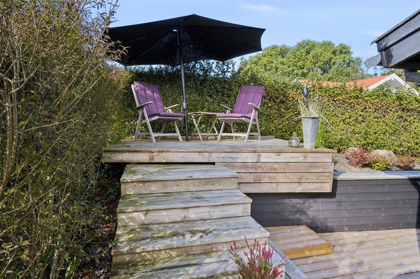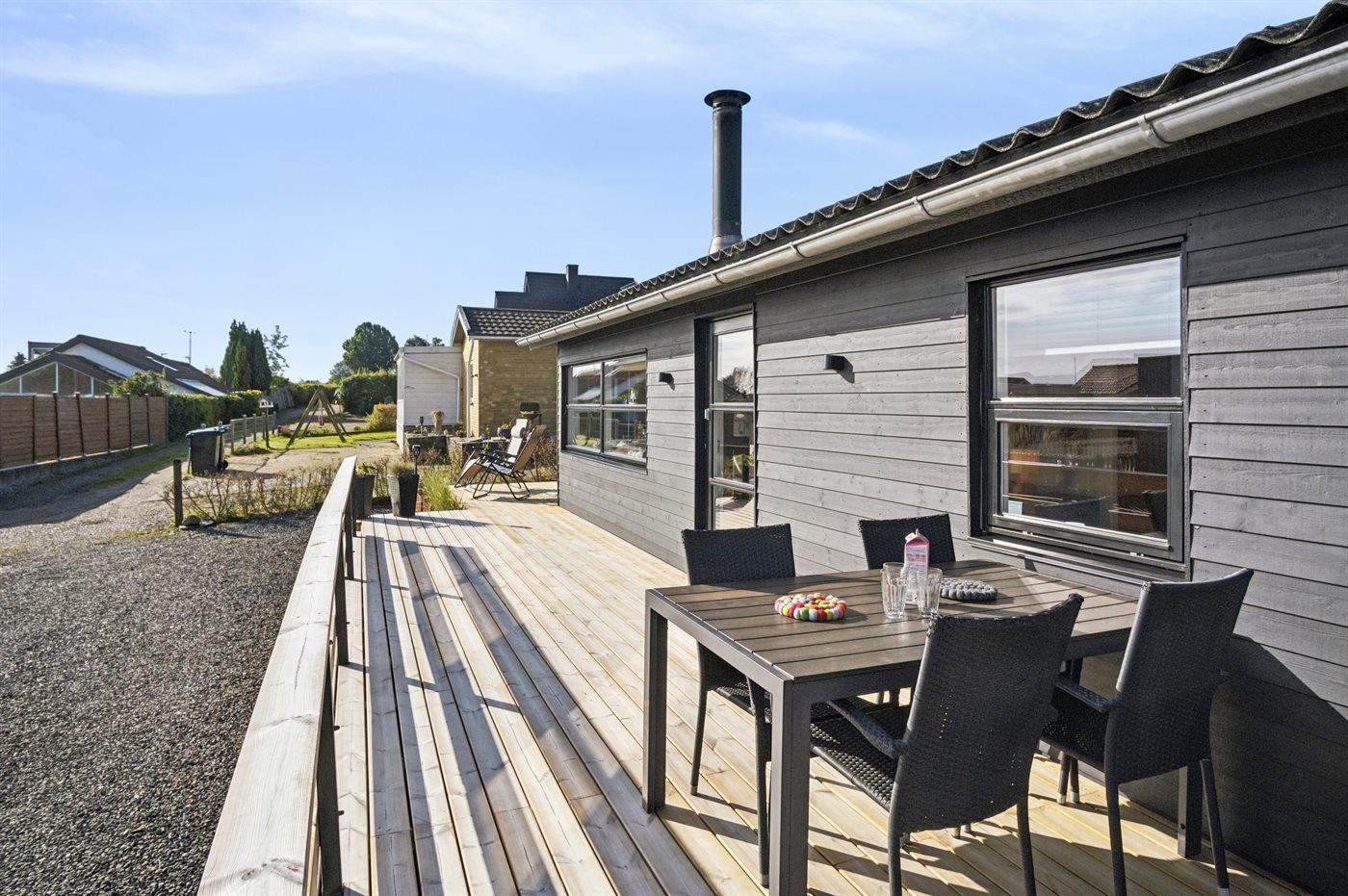 Ferieboligen er beliggende på en 400 m² stor havegrund. Der er 100 m til havet. Nærmeste forretning er beliggende i en afstand af 4000 m. Til ferieboligen hører åbent terrasseareal. Desuden er der overdækket terrasse. Sandkasse. Bålsted. Udendørs bruser. Grill til rådighed. Der er installeret stik til opladning af elbil. Type 2 stik. Med 11 kW ladeeffekt. Parkering ved ferieboligen.