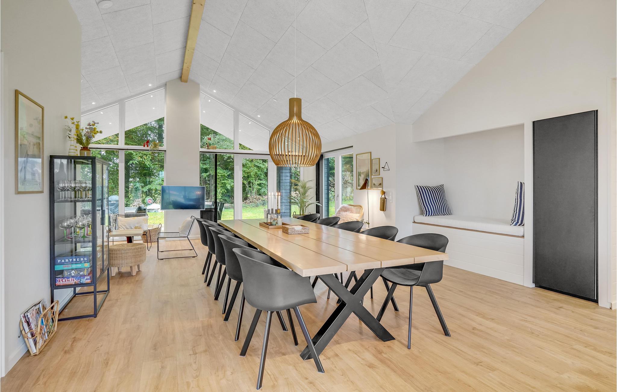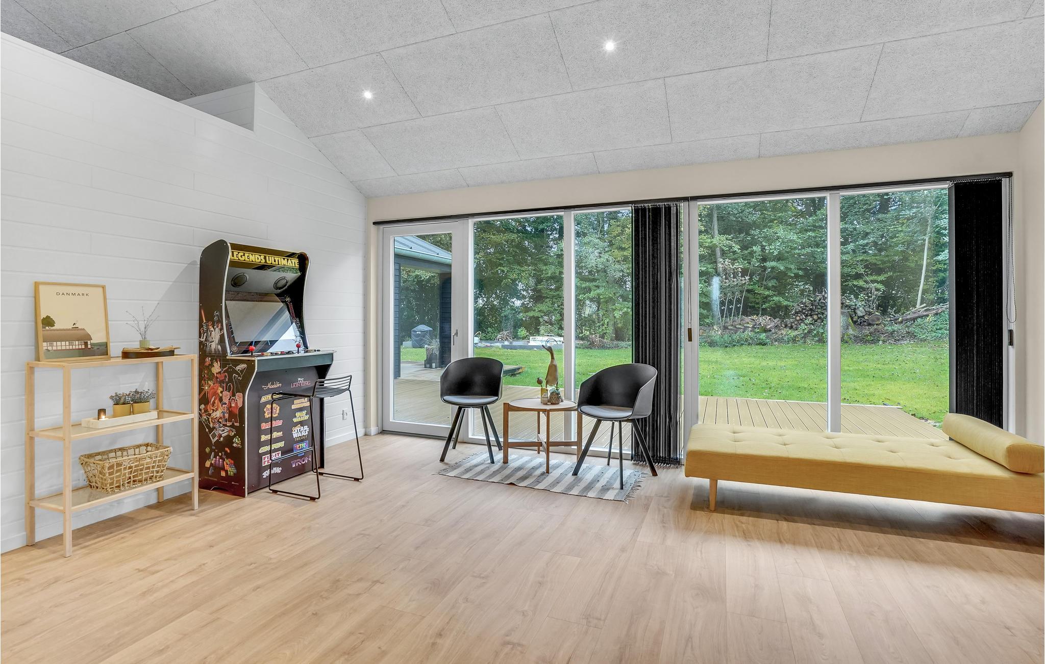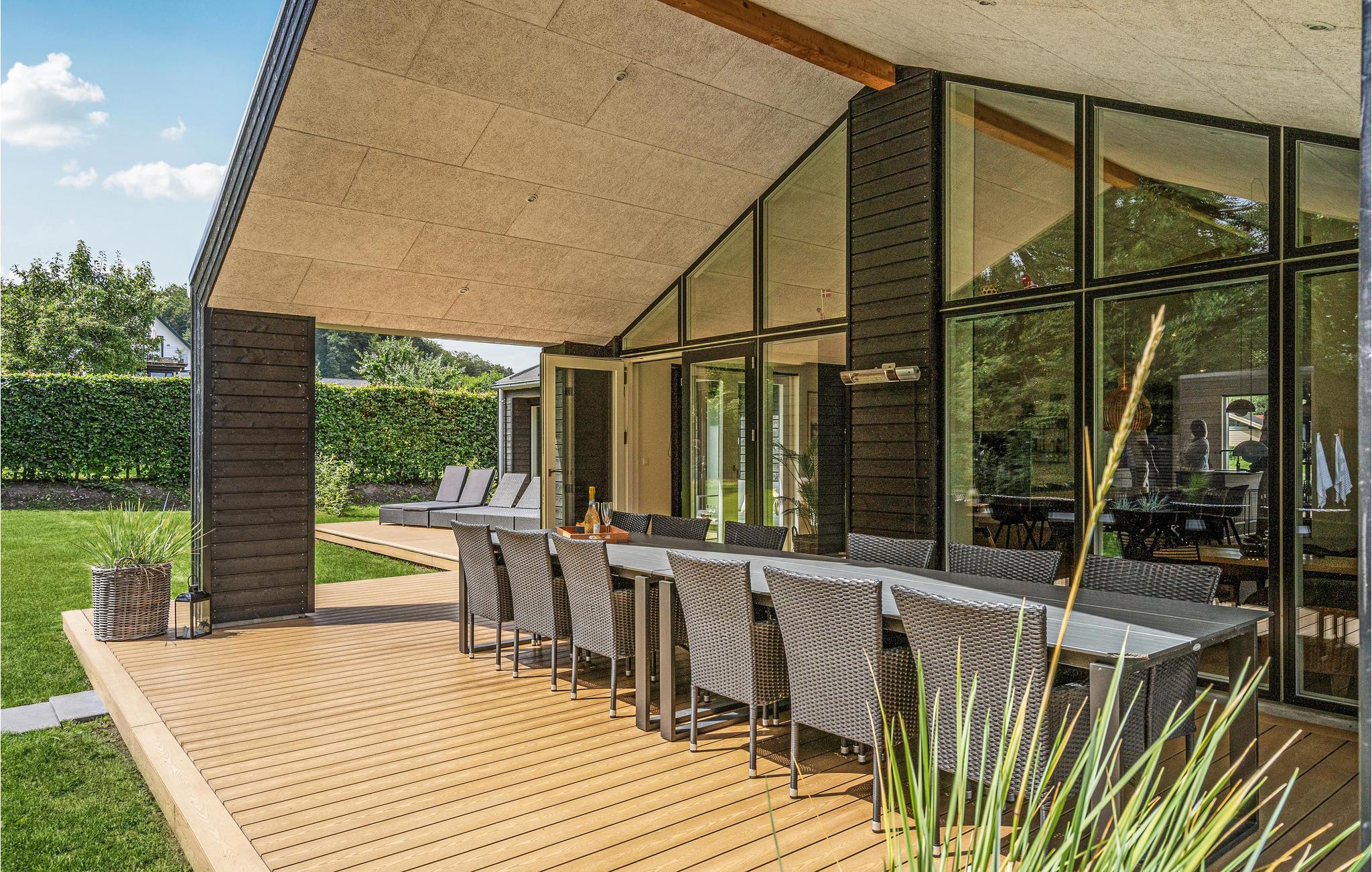 Dette lyse og moderne sommerhus byder velkommen til op til tolv voksne og et lille barn. Det består af fire soveværelser, en åben hems, to badeværelser, en stue med spisekøkken og et aktivitetsrum. I kan slappe herligt af i saunaen eller det finske vildmarksbad. På terrassen kan I spise morgenmad og senere afslutte dagen med et glas vin. En grill er til rådighed til hyggelige grillaftener. I haven er der masser af plads til at slappe af og lege.
