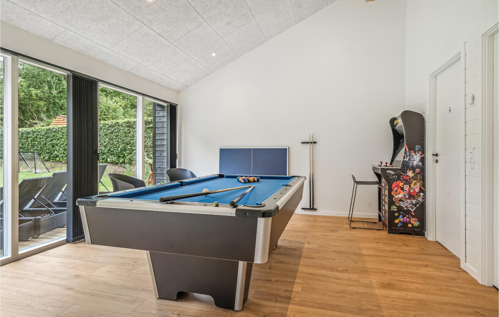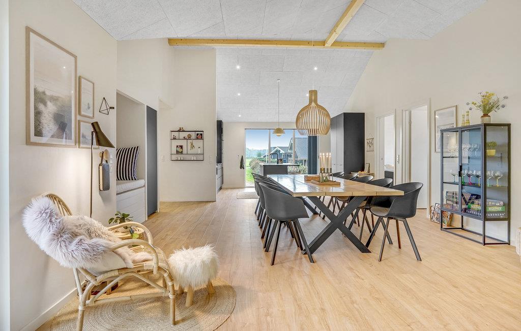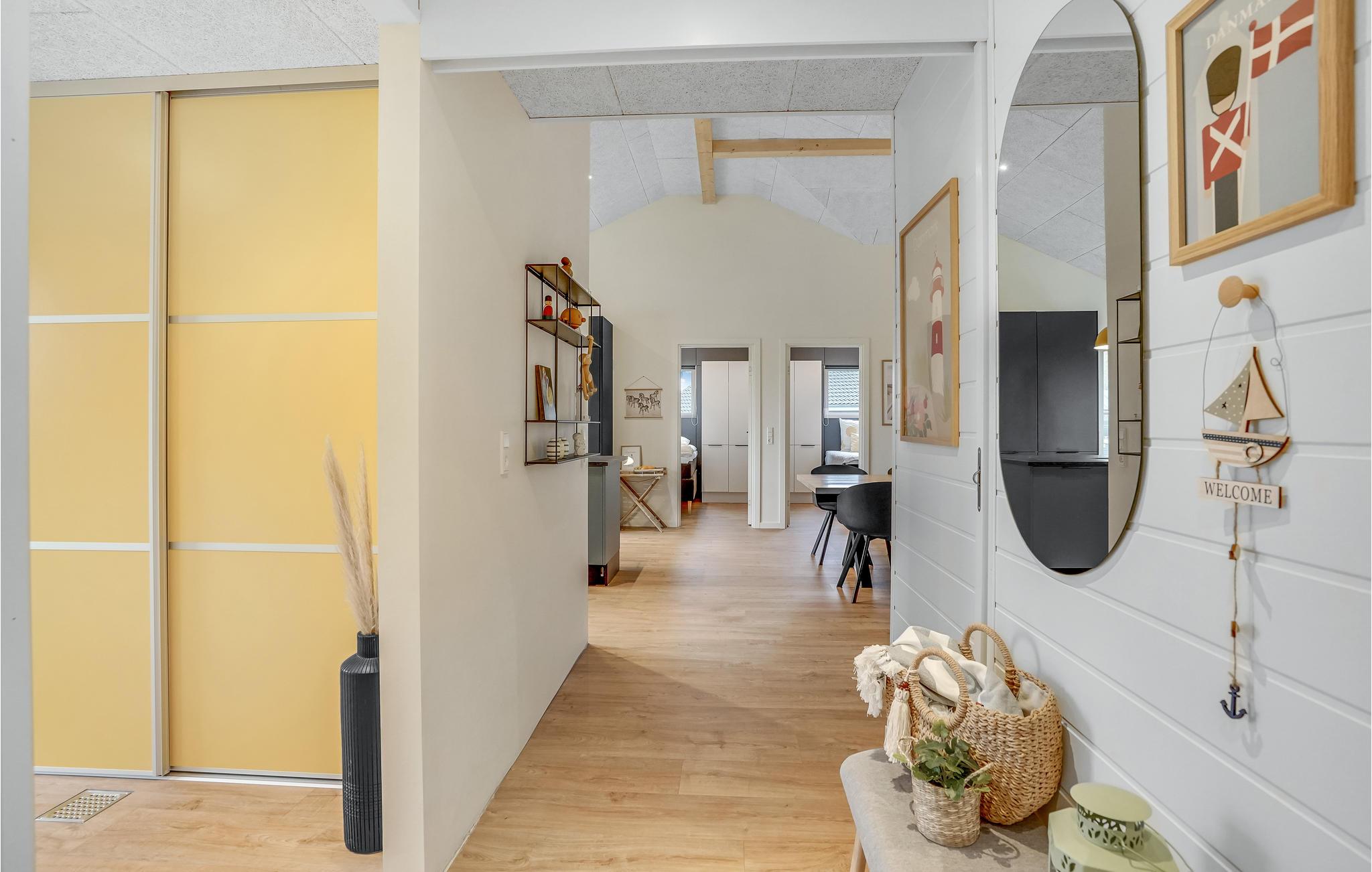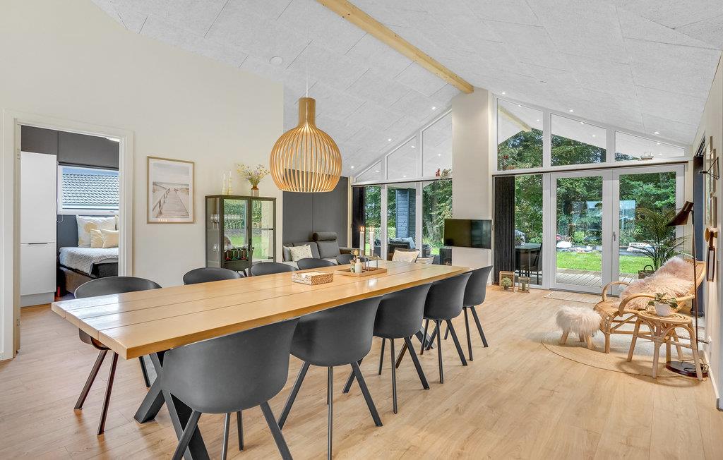 Dette lyse og moderne sommerhus byder velkommen til op til tolv voksne og et lille barn. Det består af fire soveværelser, en åben hems, to badeværelser, en stue med spisekøkken og et aktivitetsrum. I kan slappe herligt af i saunaen eller det finske vildmarksbad. På terrassen kan I spise morgenmad og senere afslutte dagen med et glas vin. En grill er til rådighed til hyggelige grillaftener. I haven er der masser af plads til at slappe af og lege.