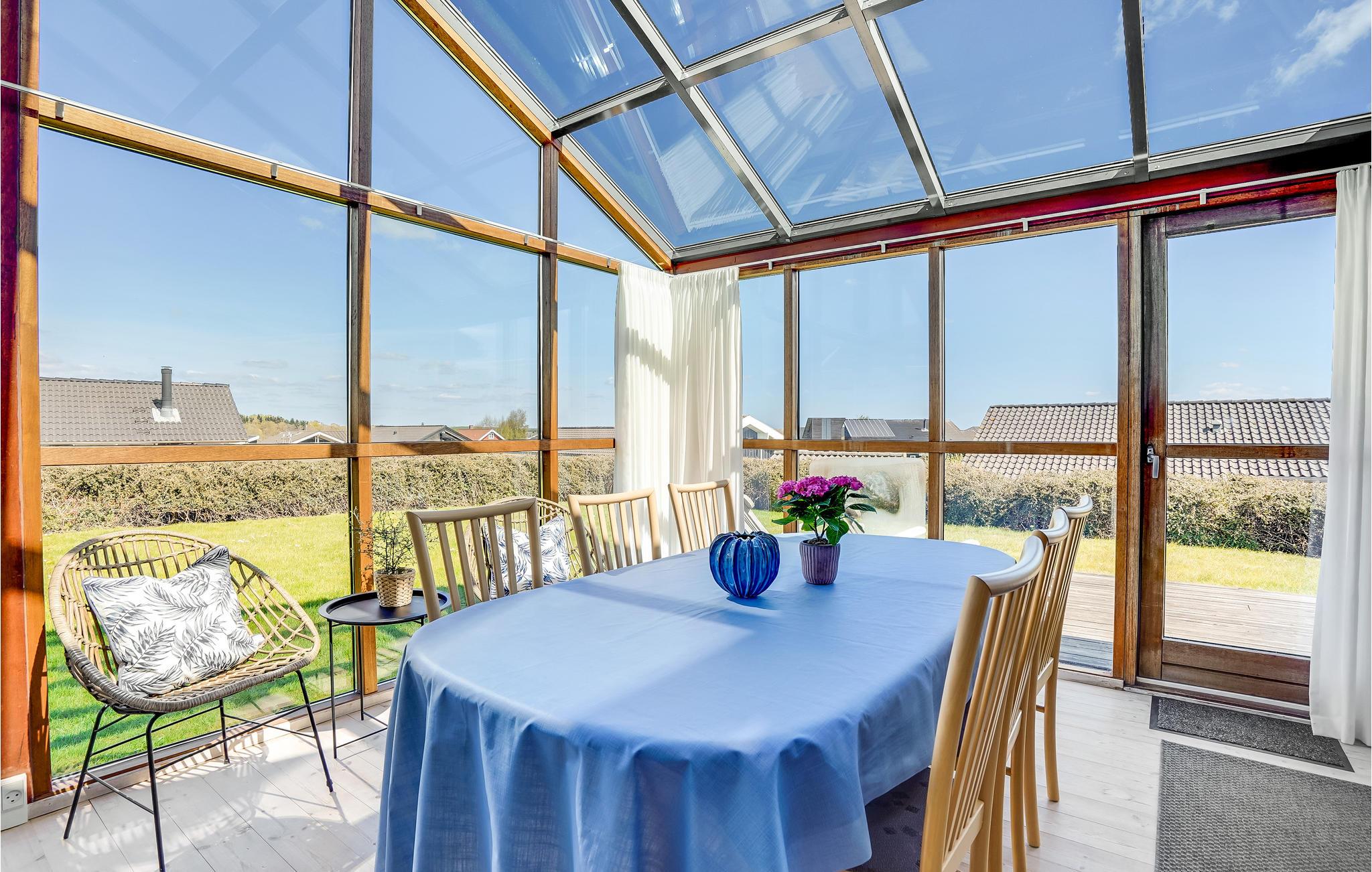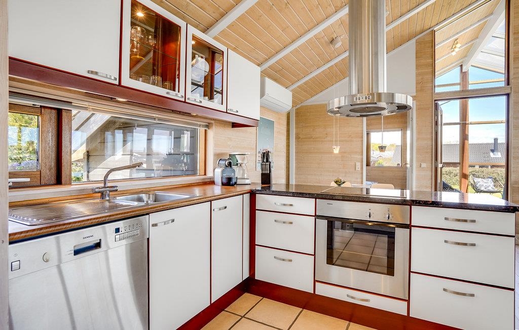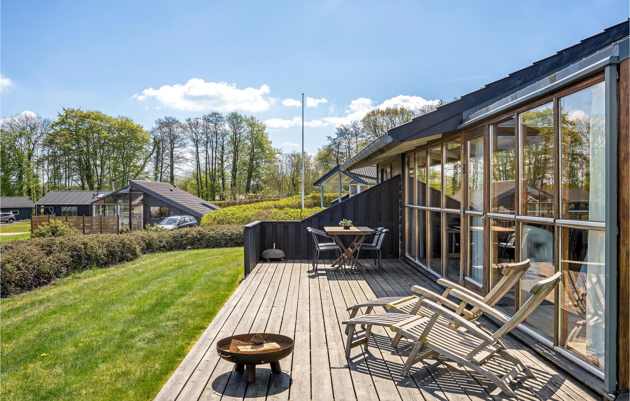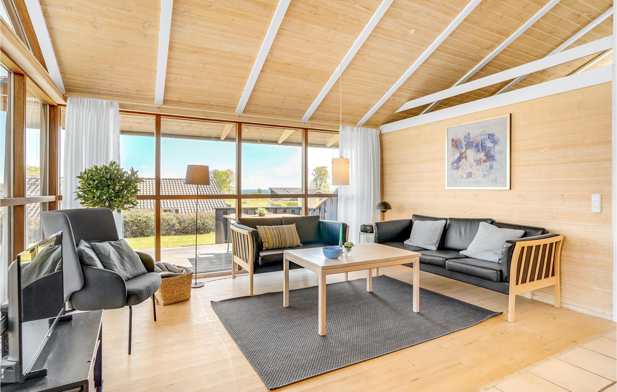 Dette smagfulde sommerhus ved Grønninghoved ligger med en smuk udsigt over vandet fra stue og terrassen. Den åbne stue ligger sammen med køkken, der har en god spiseplads. Her er store vinduespartier, der giver et godt lysindfald til rummet, i havestuen kan I rigtig kan nyde udsigten til vandet, mens I spiser dejlige feriemåltider. Huset er placeret på en stor grund med græsplæne omkranset af hæk, og med terrasser på begge sider af huset så I har mulighed for at finde både sol og skygge.