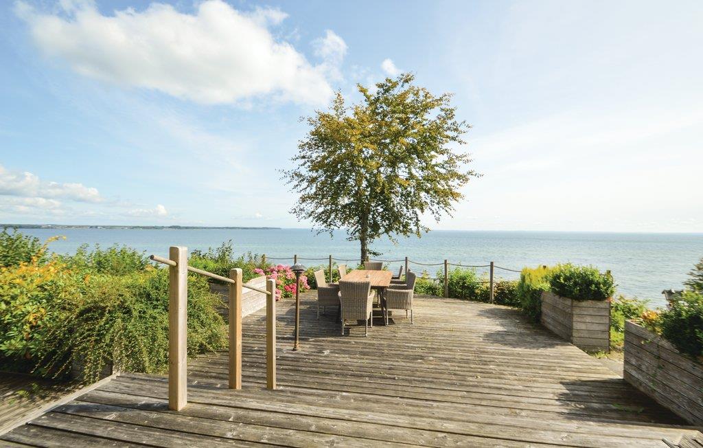 Både fra terrasserne, haven og inde fra huset er der en skøn panoramaudsigt ud over Lillebælt. Gå ned til stranden, som ligger direkte neden for huset, hvor kan I nyde strandlivet ugenert og uden en masse andre strandgæster. Indendørs er huset lyst og venligt indrettet, der er tre trappetrin fra indgangspartiet op til de to store stuer i huset, hvor det ene ligger i åben forbindelse med køkkenet. Fra den ene stue er der direkte udgang til en stor niveauopdelt terrasse, hvor I kan sidde og nyde ferien og udsigten ud over vandet. I huset er der ud over et gæstetoilet også et stort badeværelse med et spabad, hvor de ømme muskler kan få lidt vandmassage. Huset er moderne indrettet med alt hvad der forventes til en god ferie, her får I virkelig mulighed for et specielt ferieophold.