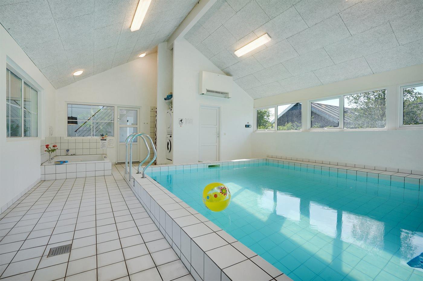 I den indendørs swimmingpool er der mulighed for leg og hyggeligt samvær. Swimmingpoolen måler op til 4,05 m i bredden, 4,9 m i længden og den er op til 1,6 m dyb. Vandet er mellem 24 og 28° C varmt. Der er gulvvarme i swimmingpoolområdet.
