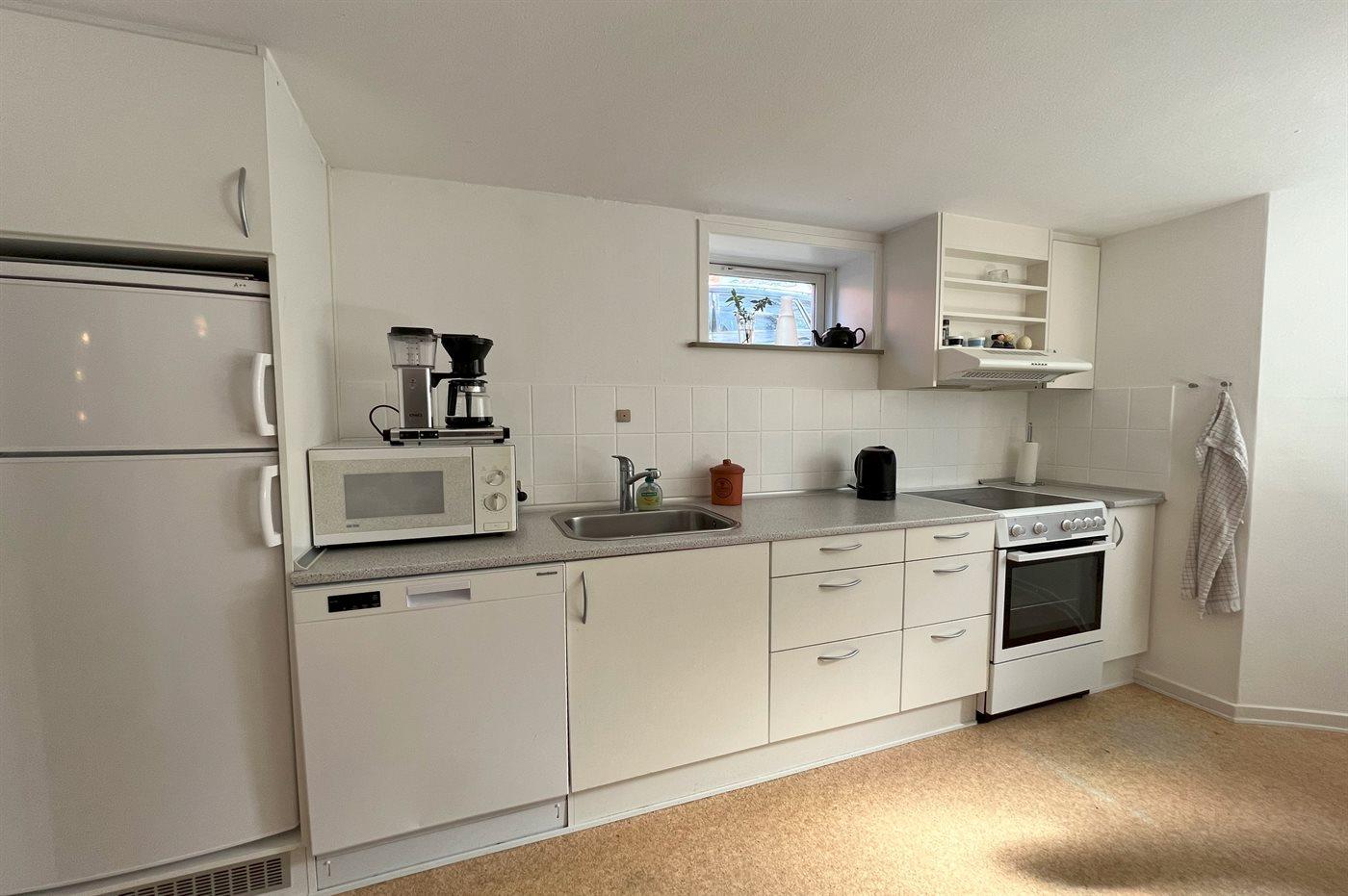 Køkkenet er udstyret med 1 køleskab. Der er 4 keramiske kogeplader, varmluftovn, mikrobølgeovn samt opvaskemaskine.