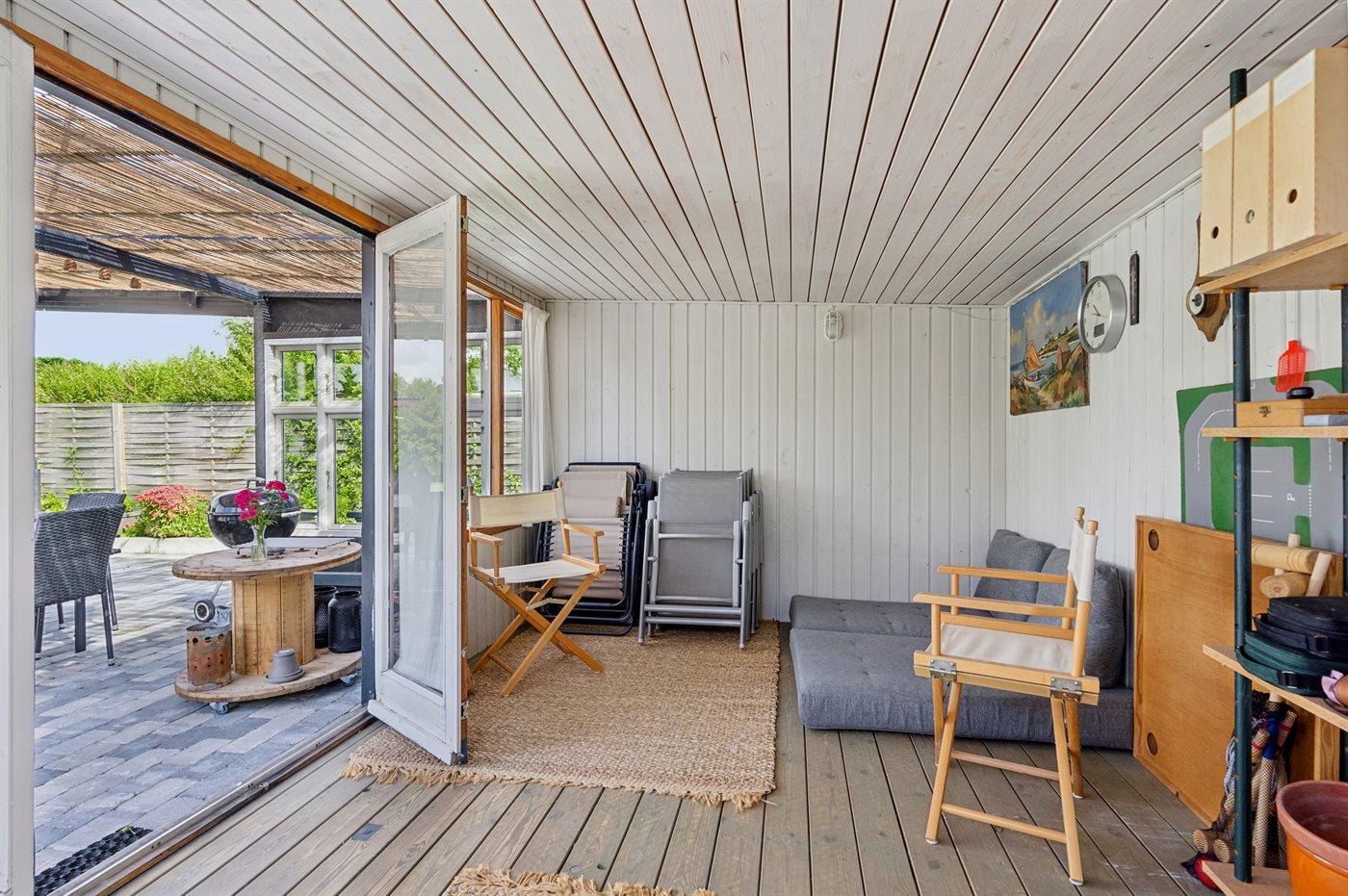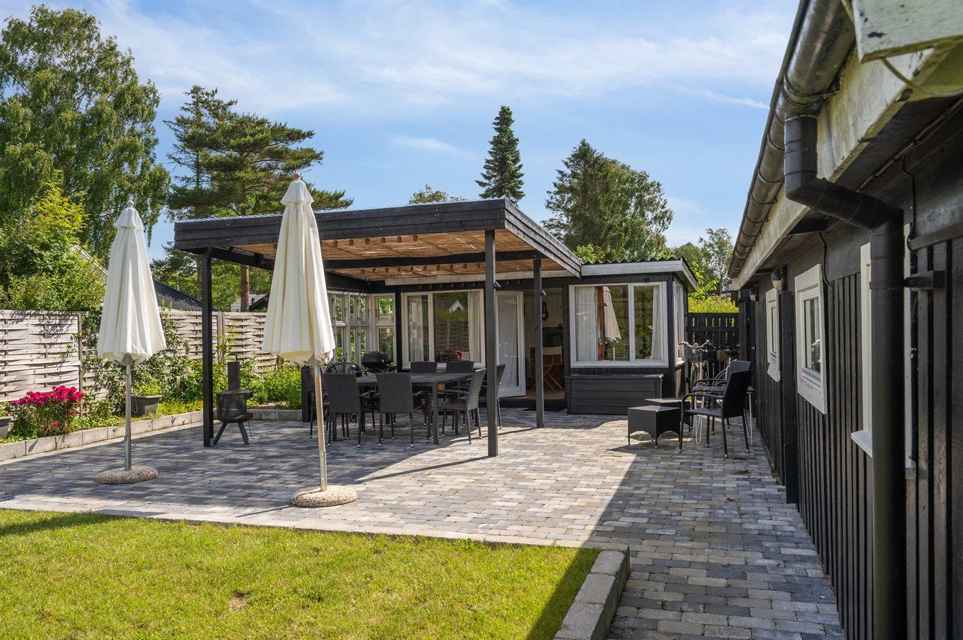 Sommerhuset ligger helt ugeneret på den dejlige grund og har nogle gode terrassearealer, som også delvist er overdækket. Herfra kan man i særdeleshed nyde de skønne omgivelser med en kop kaffe eller et glas vin, og det er altid muligt at finde en lækrog at nyde solen i.