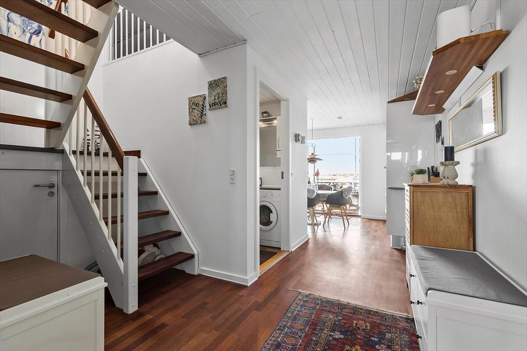 til maritim charme og hygge. Ved Grenaa Marina ligger dette velholdte sommerhus, der emmer af maritim stemning og afslappet luksus. Når du træder ind i underetagen, mødes du af et stilfuldt køkken med en hyggelig spiseplads, hvor dagens måltider kan nydes med udsigt til vandet. Herfra fører en dør ud til en charmerende terrasse, der næsten bringer dig helt tæt på havoverfladen. Det er også her, du finder et af husets soveværelser med en dobbeltseng samt et badeværelse med praktiske faciliteter som vaskemaskine – perfekt til en ferie, hvor det praktiske ikke fylder.