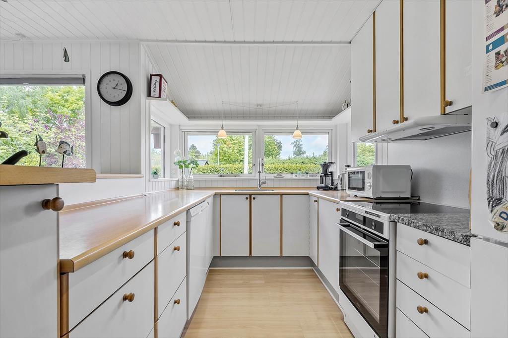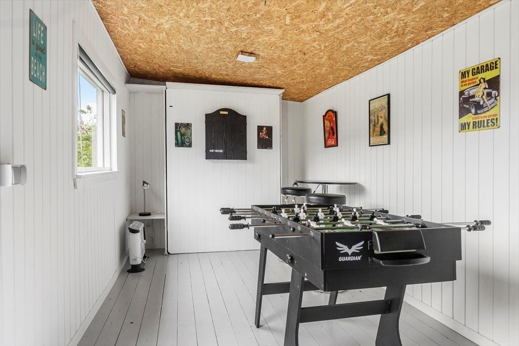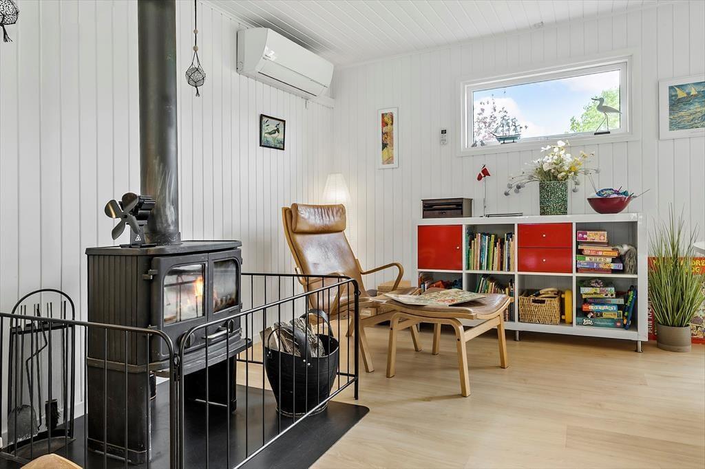Nær en af Jyllands allerbedste badestrande finder du dette hyggelige og velindrettede sommerhus – et perfekt sted til en afslappende ferie med dem, du holder af. Huset byder på en lys og indbydende stue, hvor komfortable møbler, en knitrende brændeovn og en varmepumpe skaber den helt rette atmosfære. Her kan du læne dig tilbage med en god bog eller samle familien til hyggelige stunder. I åben forbindelse med stuen ligger det flotte køkken, der er udstyret med alle de faciliteter, du har brug for – herunder en opvaskemaskine, der gør livet lidt lettere. Huset har to badeværelser, og det ene er ekstra luksuriøst med et badekar, der indbyder til afslapning efter en dag fuld af aktiviteter. Når det er tid til at finde ro, venter fire gode værelser på dig. Tre af værelserne har dobbeltsenge, mens det fjerde byder på en god, dobbelt sovesofa – ideel til overnattende gæster eller teenagere, der vil have deres eget hjørne. De mindste feriegæster er heller ikke glemt, for huset er udstyret med barneseng og høj stol. Og til de lidt større børn – og barnlige sjæle – er der et renoveret haveskur med både bordfodbold og dart, hvor familien kan dyste om titlen som feriechampion.