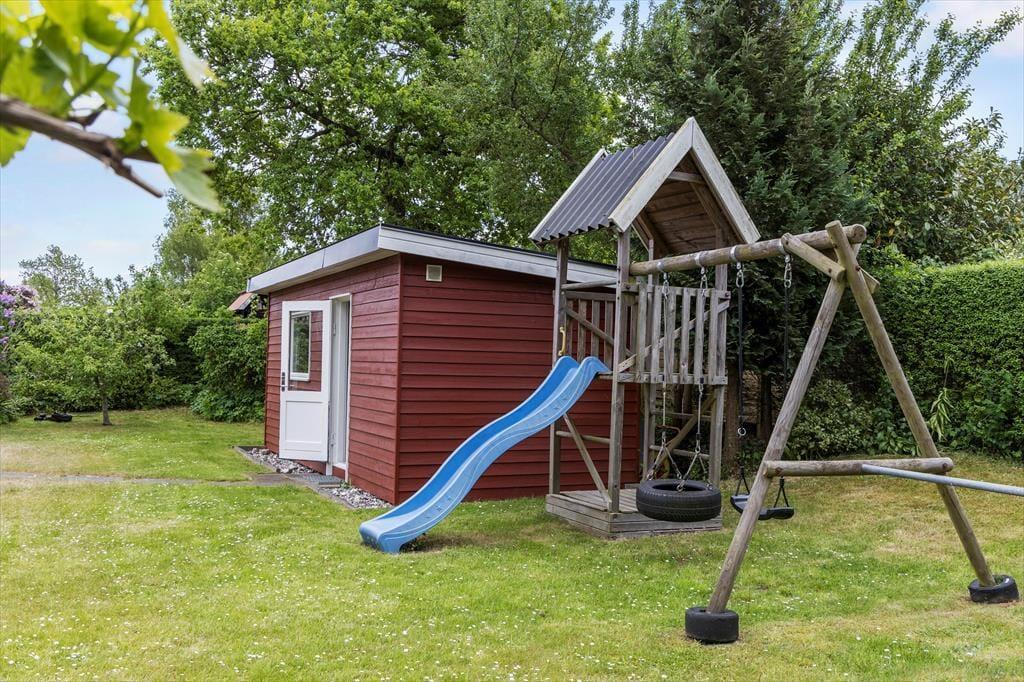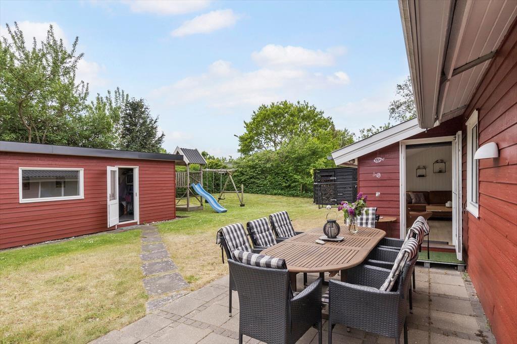 Sommerhuset ligger på en herlig naturgrund, der oser af hygge og ferieglæde. De mindste kan kaste sig over sjove eventyr i sandkassen, svinge sig højt mod himlen på gyngen eller suse ned ad rutsjebanen – her er garanteret grin og glade dage. Imens kan de voksne læne sig tilbage i de bløde havemøbler på den solbeskinnede sydvendte terrasse, nyde en god bog eller bare lukke øjnene og mærke feriefreden sænke sig. Når maverne begynder at rumle, er grillen klar til at trylle lækre måltider frem, som kan nydes i det fri – med fuglefløjt og feriedufte som perfekte ledsagere.