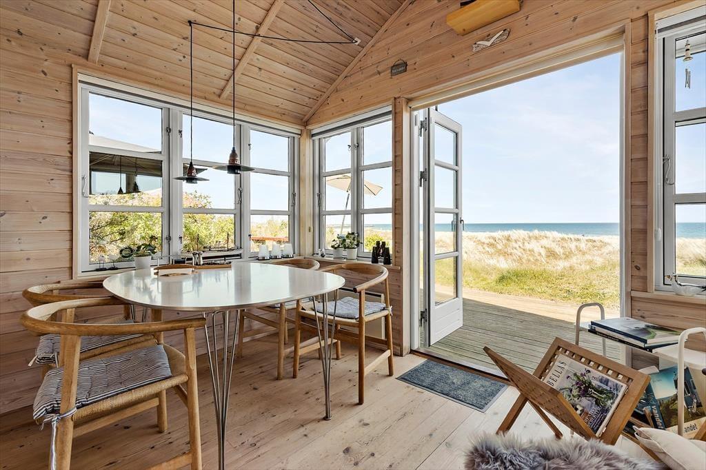 Indenfor mærker du det med det samme. Det er ikke et klassisk sommerhus, men et personligt fristed med varme, stemning og historie i væggene. De sprossede vinduer lukker lyset ind i gyldne striber, og selv på en stille formiddag kan du høre bølgerne og mærke den friske havduft helt inde i stuen.