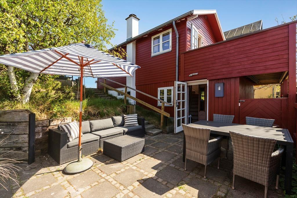 På husets anden side finder du en vestvendt og helt lukket aftenterrasse, hvor solen smukt siger tak for i dag i langerøde stråler, og duften af grill breder sig fra den lille grillgård. Her sidder du længe og nyder livet. Rundt om huset er der flere små, læ fyldte gårde, bænke og forskellige udsigtsspots til både stille stunder og lej.