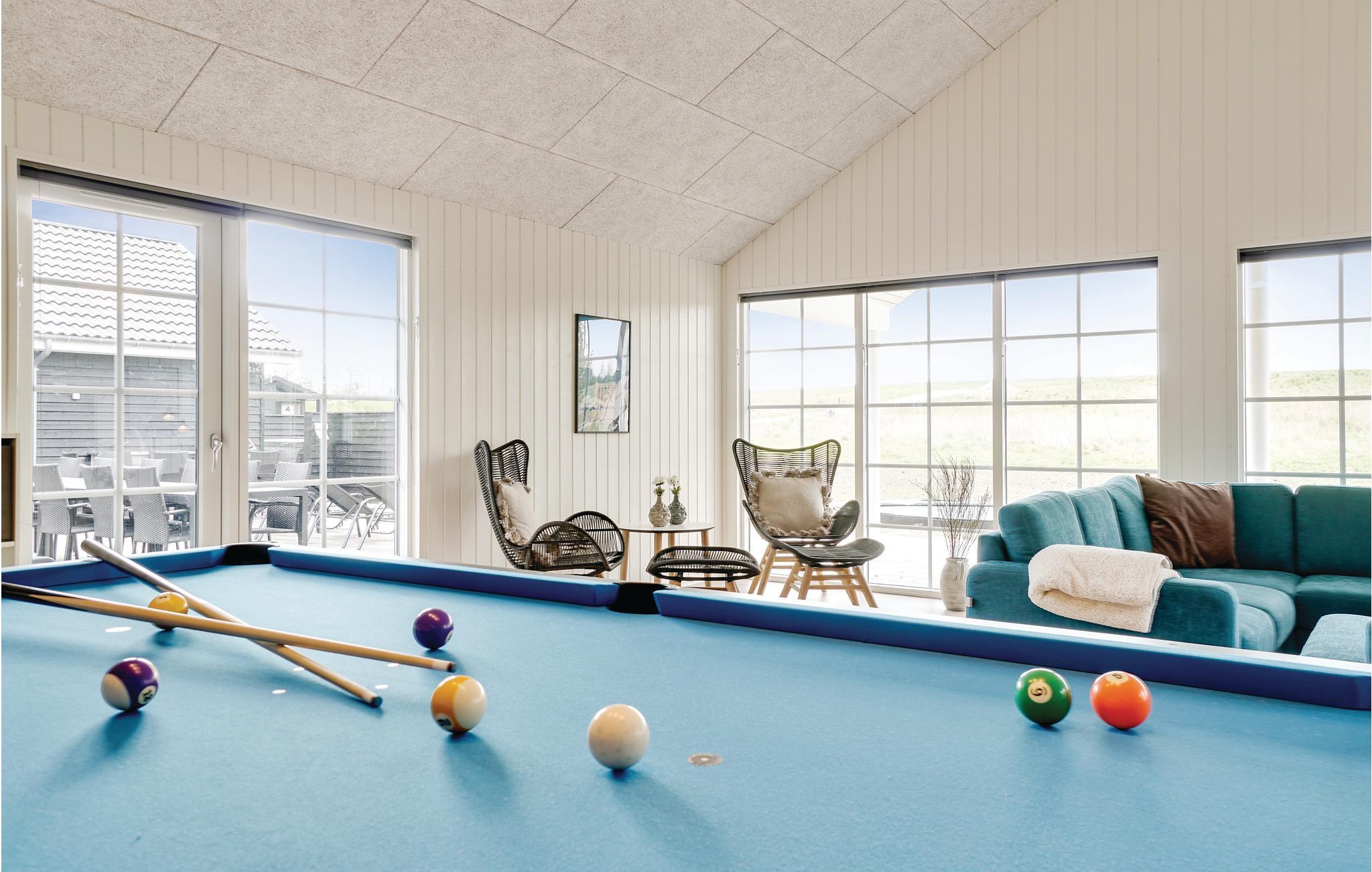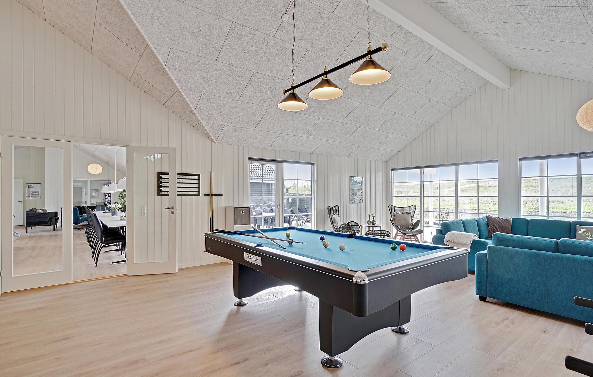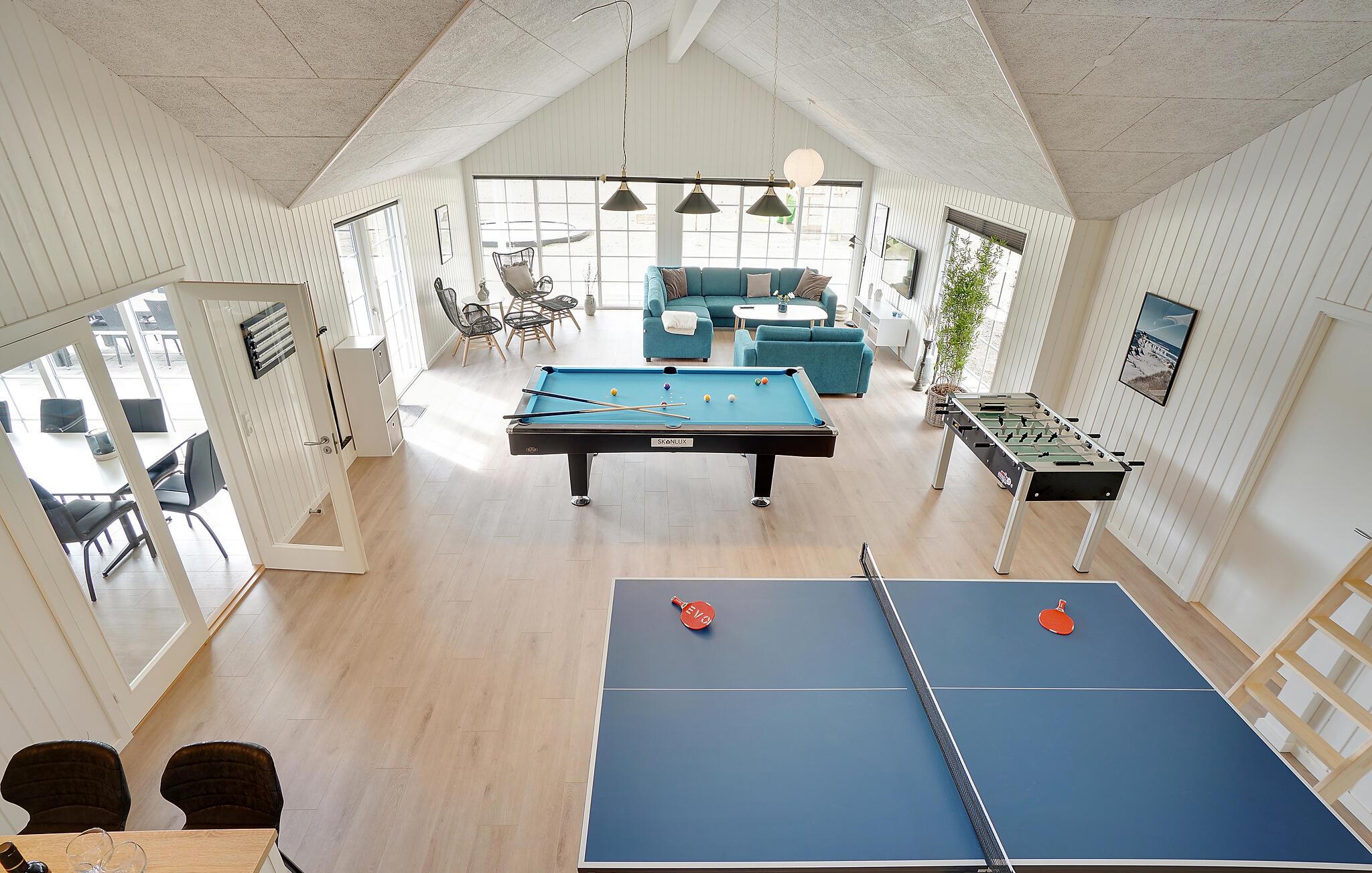 I den ene ende af poolhuset ligger det populære spillerum. Her kan I dyste i et slag billard eller spille en omgang bordtennis, dart eller bordfodbold. Her er god plads til fart over feltet. Fra baren i hjørnet er der plads til tilskuere, mens der kan slappes af i sofakrogen eller spilles Play Station 4.