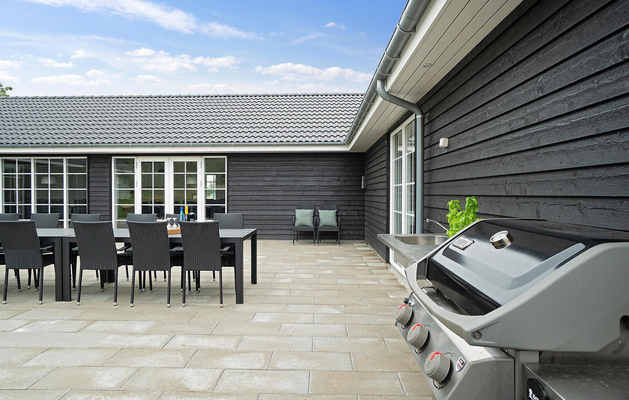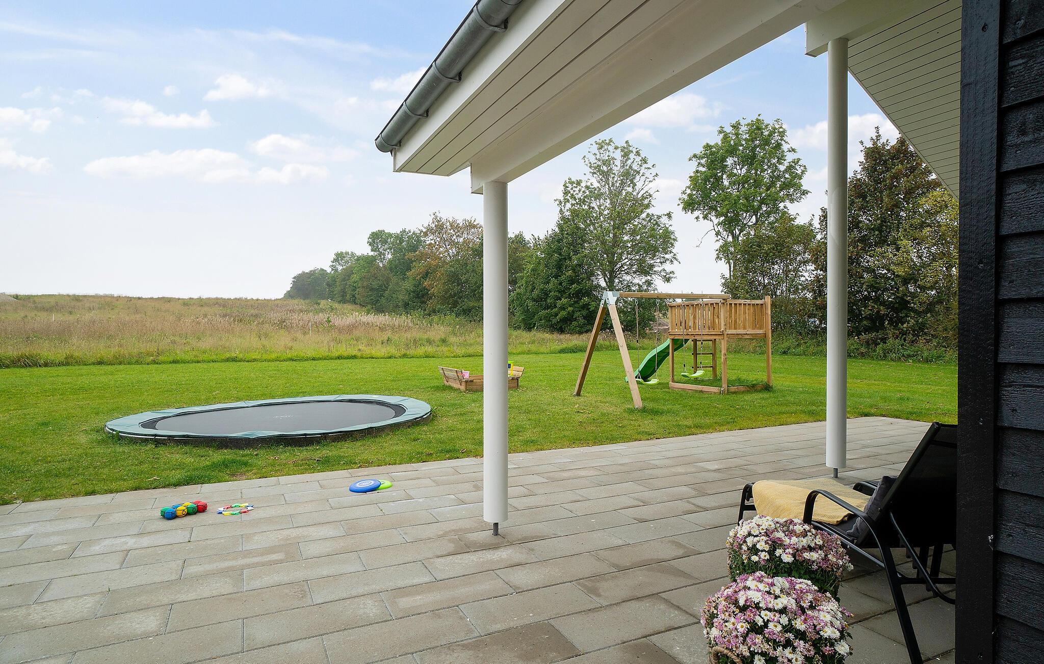 Udendørs finder I håndvask med bord, som kan bruges som både grovkøkken eller fiskerenseplads, hvor lystfiskeren kan rense dagens fangst. Den delvist overdækkede terrasse er udstyret med havemøbler og grill. I haven er der både gynge, sandkasse og trampolin til de yngste gæster.