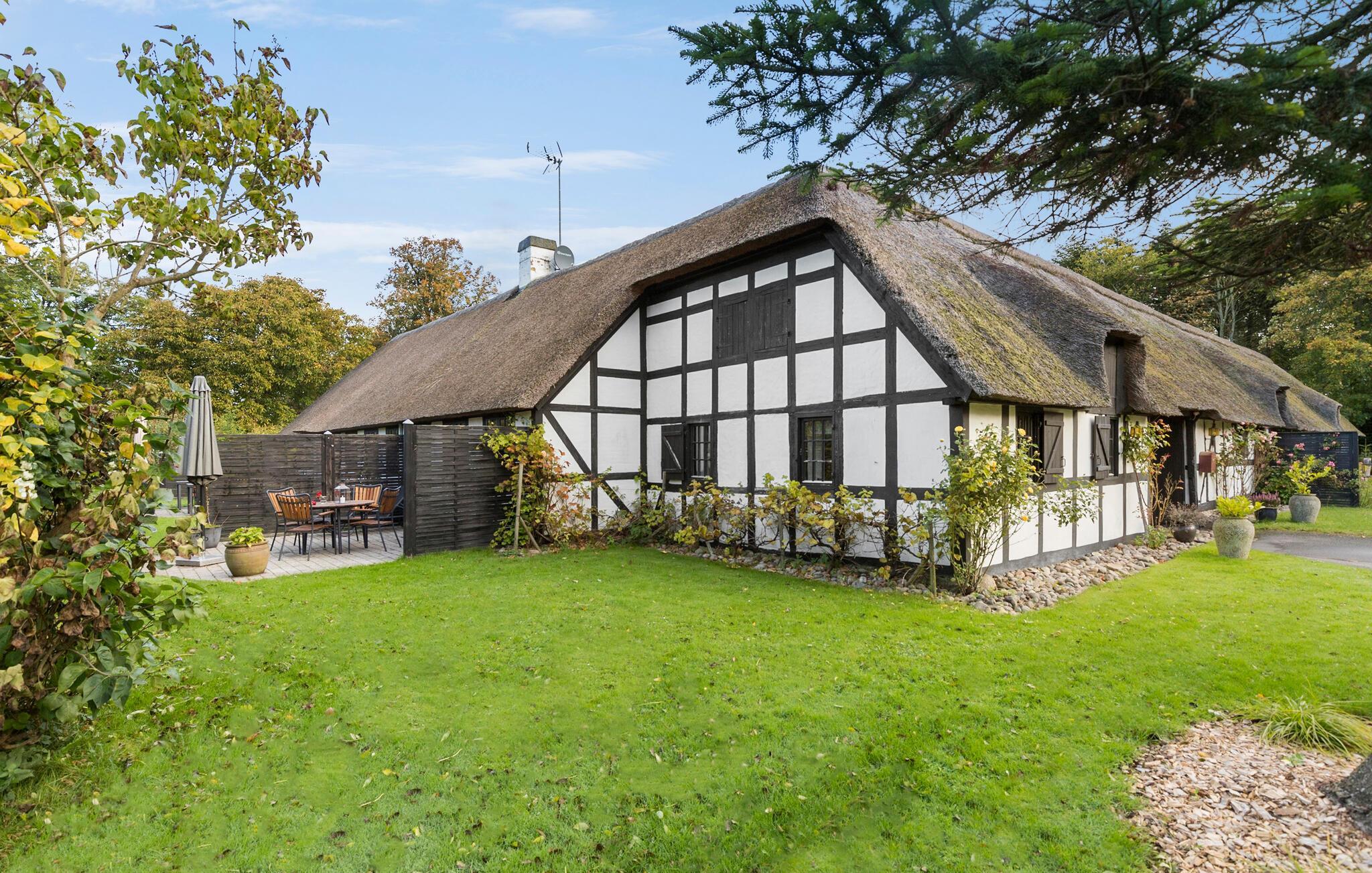 Charmerende stråtækt feriehus i Vejlby nær Grenaa med moderne komfort og idyllisk terrasse.