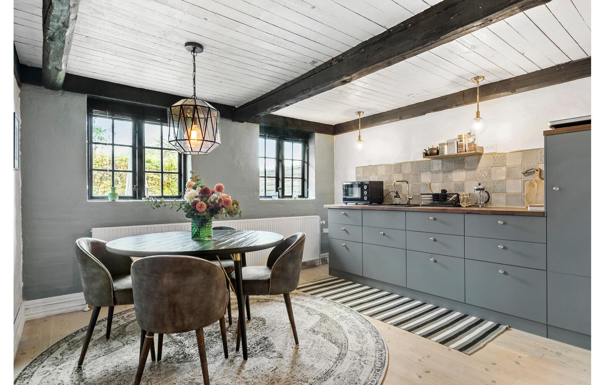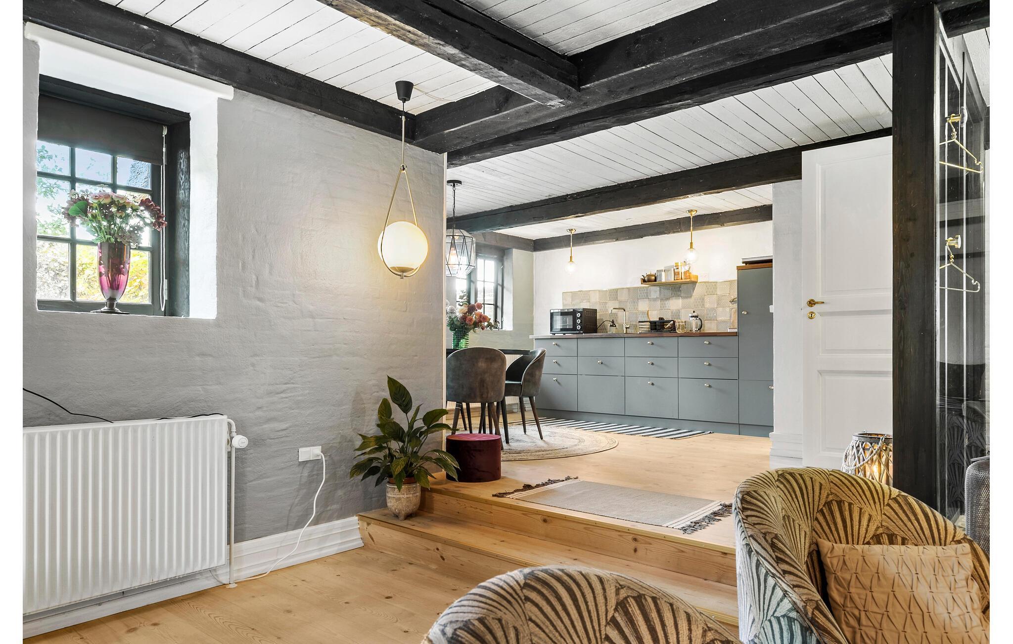 Slap af i de stilfuldt indrettede indendørsområder, der med varme træbjælker og en harmonisk farvepalette skaber en hyggelig landhusstil-atmosfære. I det moderne spisekøkken kan I tilberede jeres yndlingsretter og nyde dem sammen. Tilbring hyggelige aftener i stuen, som er udstyret med en komfortabel sofa og behagelige lænestole, der indbyder til afslapning.