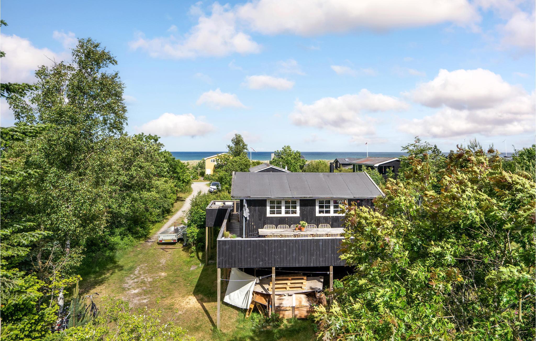 Vidunderligt strandhus med pælefundament.