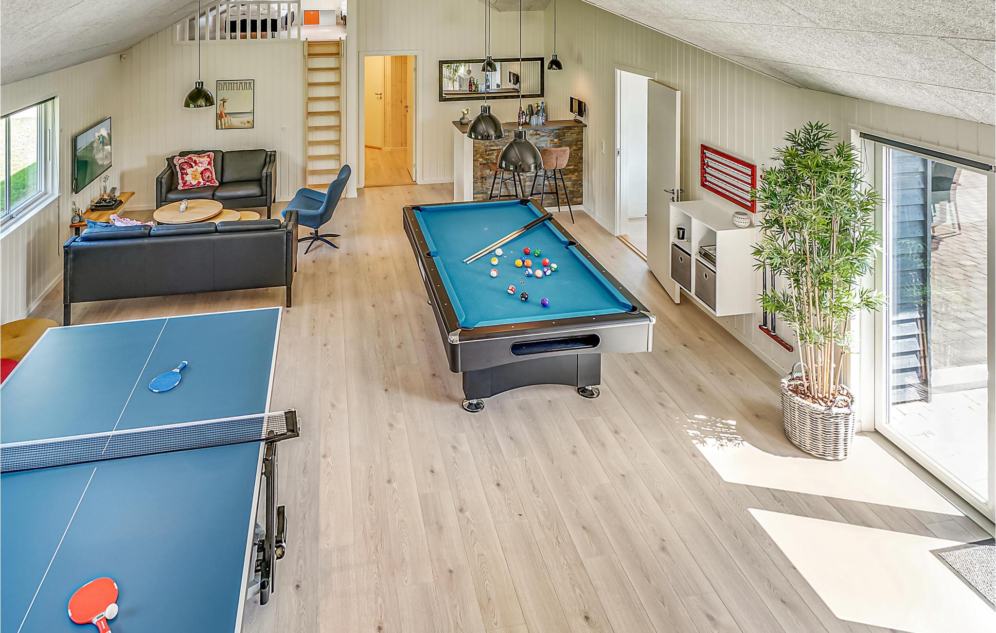 I den ene ende af sommerhuset ligger det populære aktivitetsrum, hvor I kan dyste i et slag billard eller spille en omgang bordtennis, dart eller bordfodbold. Her er god plads til fart over feltet. Fra baren i hjørnet er der plads til tilskuere. Baren er udstyret med vinkøleskab, så I kan nyde et glas vin med den helt rigtige temperatur. Der er også mulighed for at slappe af i sofakrogen eller spille Play Station 4. ( DVD)