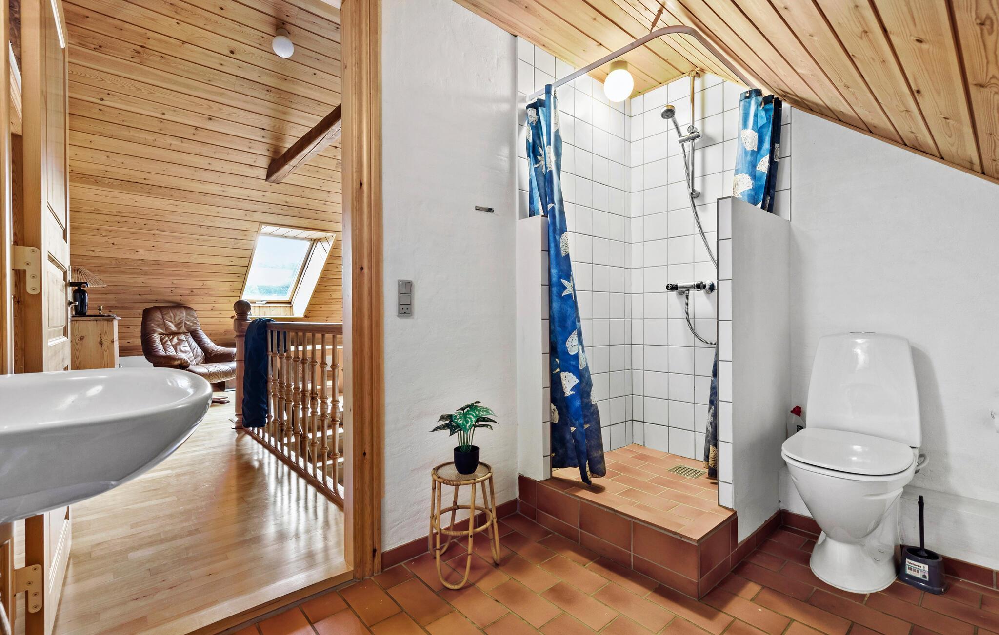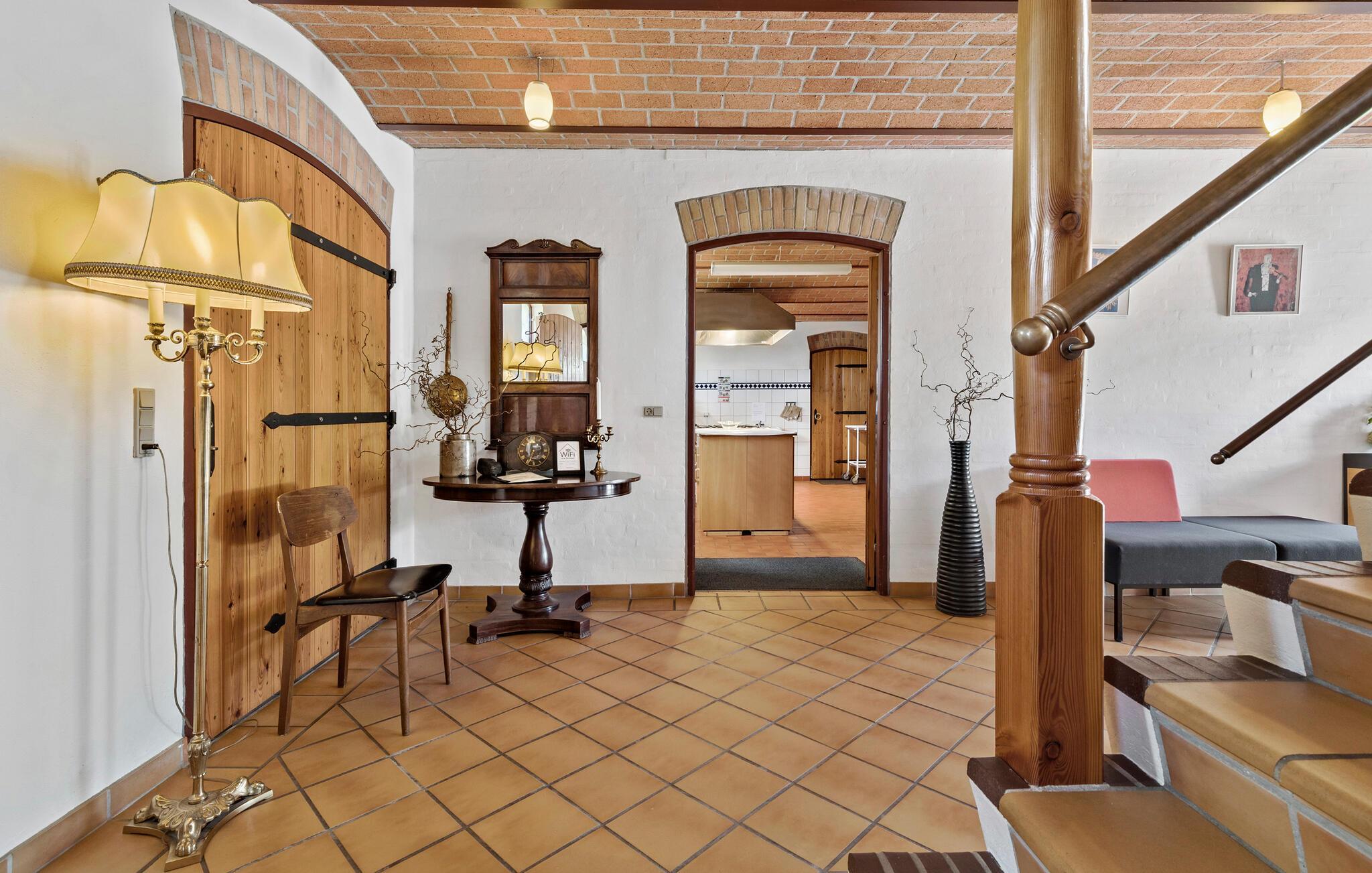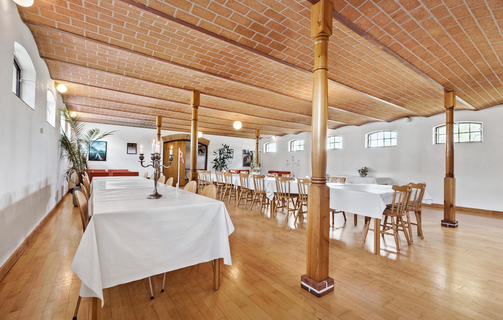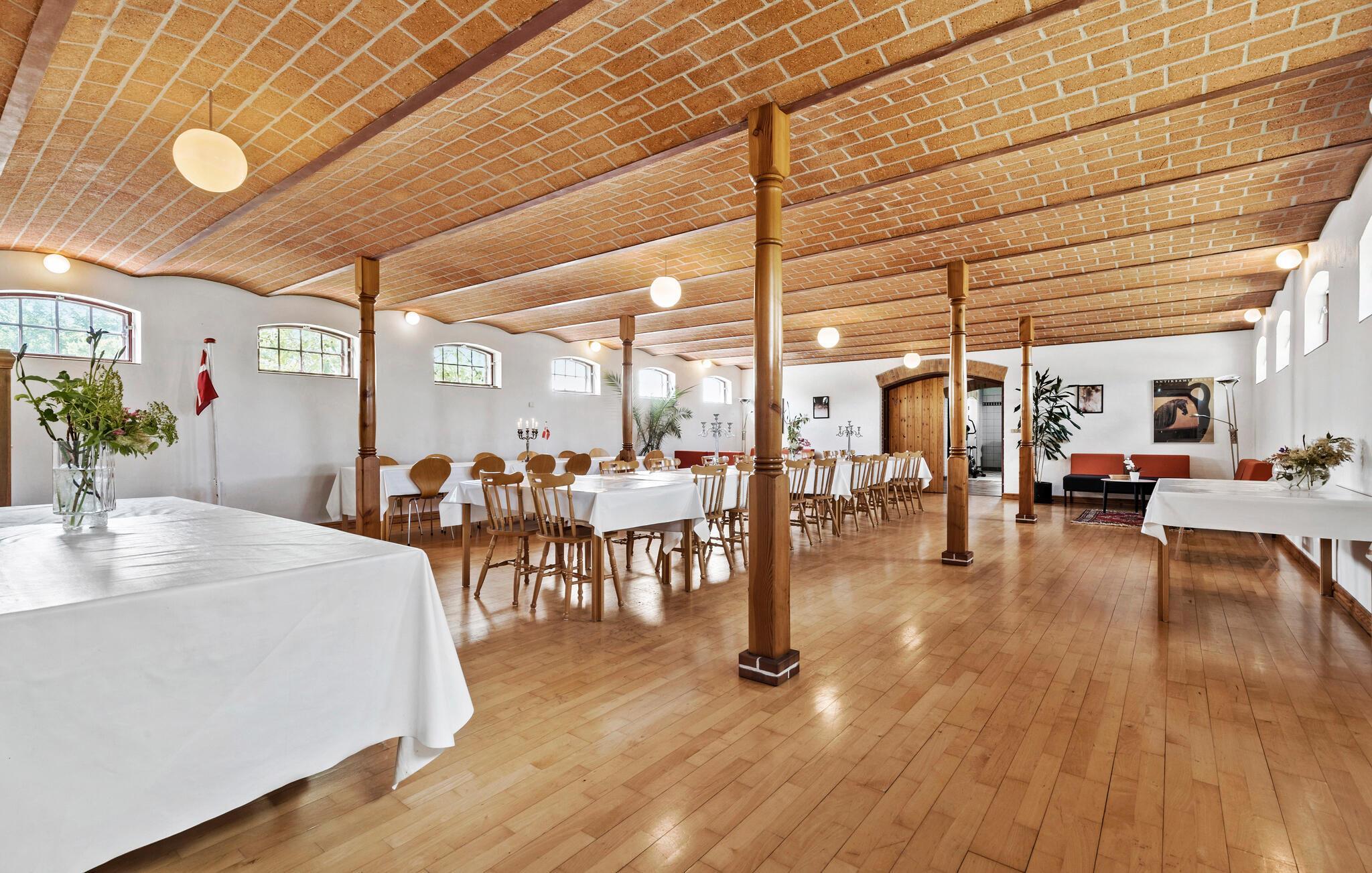 Der er lagt op til en ferie ud over det sædvanlige med dette feriehus på Djursland. Her åbner der sig et væld af muligheder, for ferieboligen spreder sig over flere plan, bygninger og et stort antal kvadratmeter. Måske skal I holde den store familiefest hen over flere dage, eller også drømmer I om at invitere jeres vennefamilier med på en tur, hvor der er plads til alle og rum for sjove aktiviteter både inde og ude. Gården har mange fine stiltræk, der peger tilbage i tiden, lige fra trægulvene til det murede loft i gildesalen, en smuk hall og et nostalgisk køkken, hvor både børn og voksne kan slå sig løs.