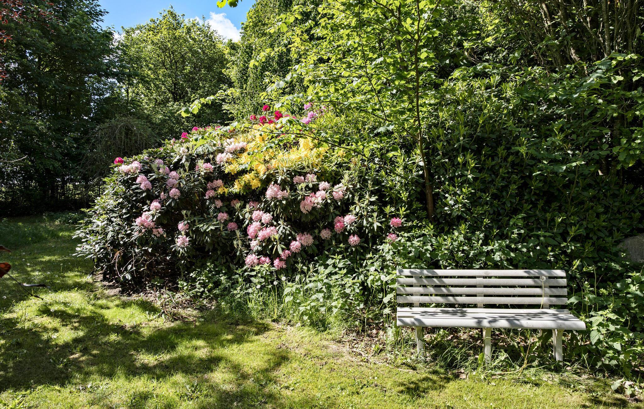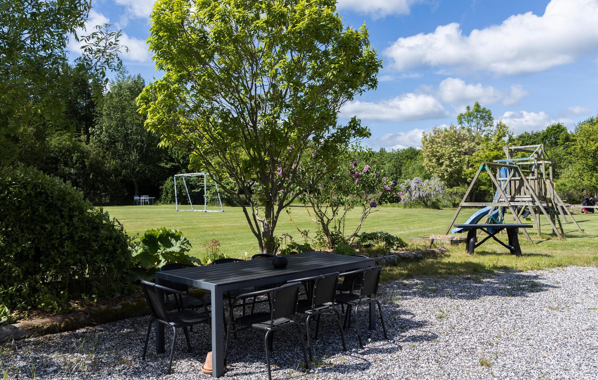 Udendørs venter der både en romantisk have med blomster og gamle træer og åbne arealer med plads til sjove boldspil. Her kan I sætte jer til rette med en god bog på havebænken, spille fodbold eller tænde op i grillen, mens de mindste suser ned ad rutsjebanen og hopper på trampolin.