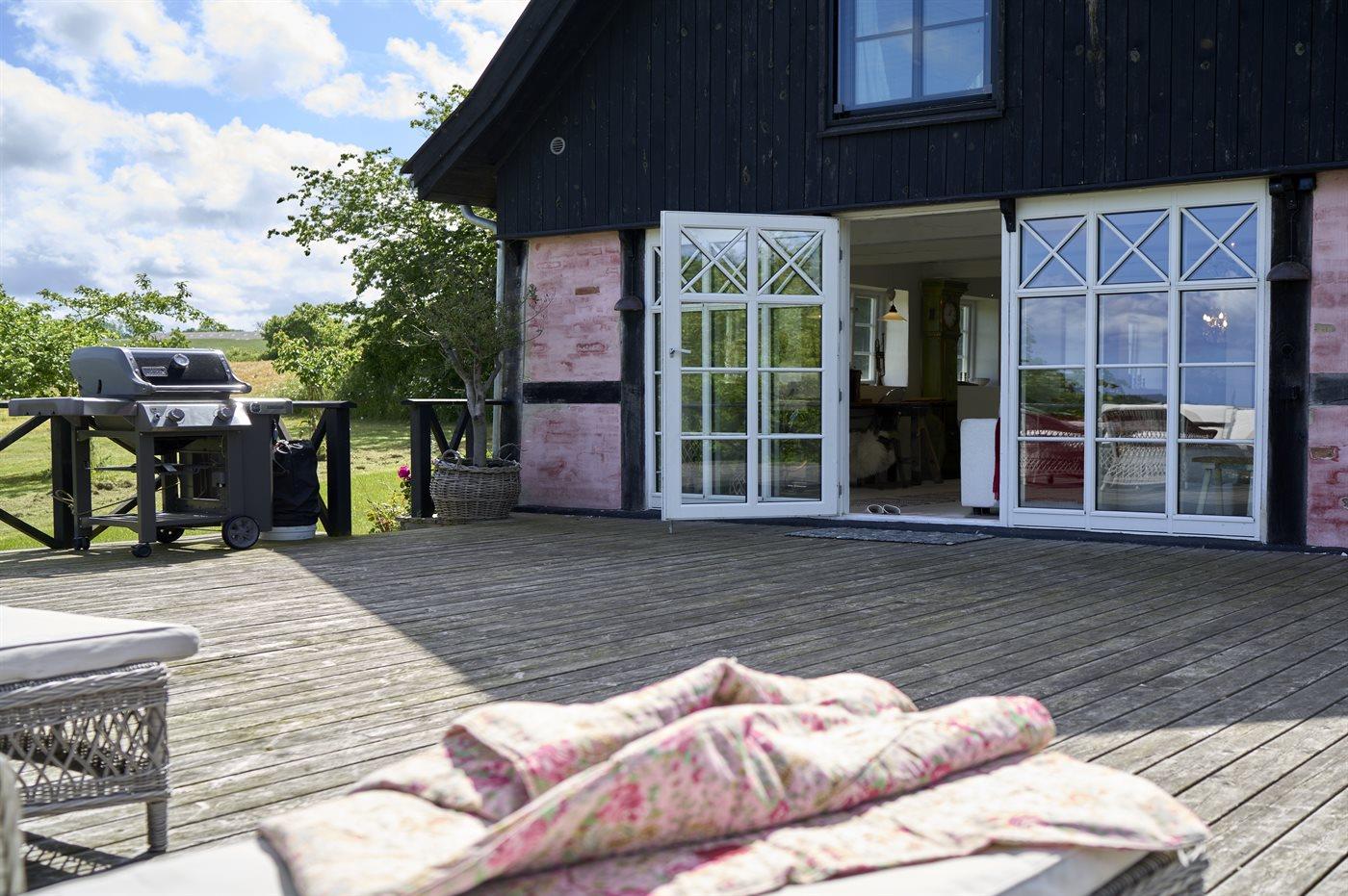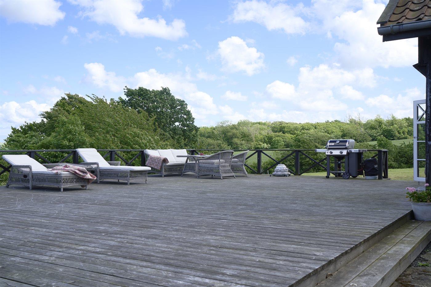 Fra stuen er der direkte udgang til en virkelig stor terrasse i niveau. Der findes både spisebordssæt, loungemøbler, solstole og gasgrill.