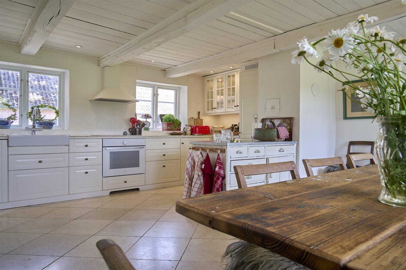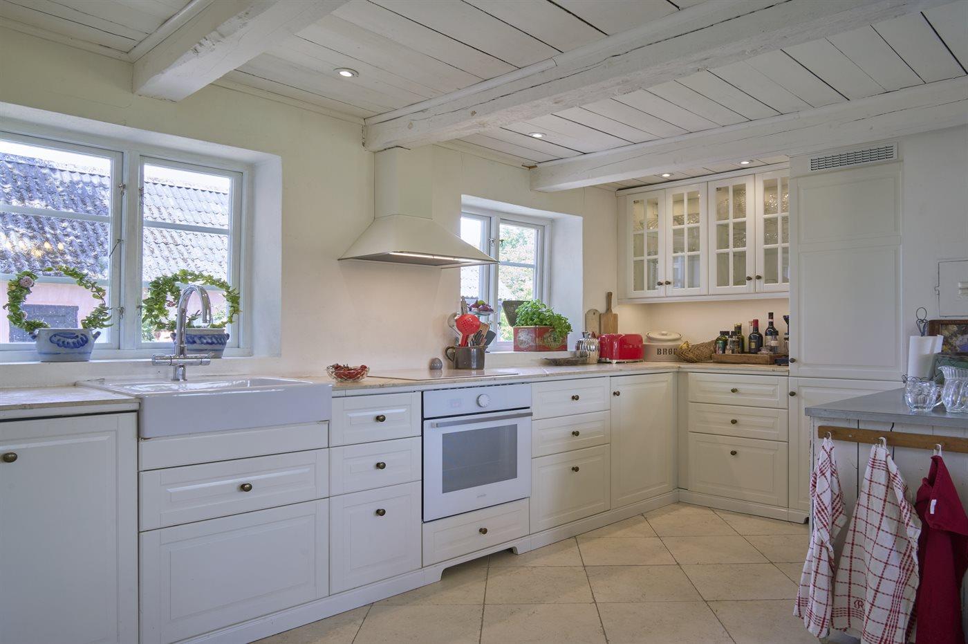 Køkkenet er udstyret med 1 køleskab. Der er 4 induktionskogeplader, varmluftovn samt opvaskemaskine.