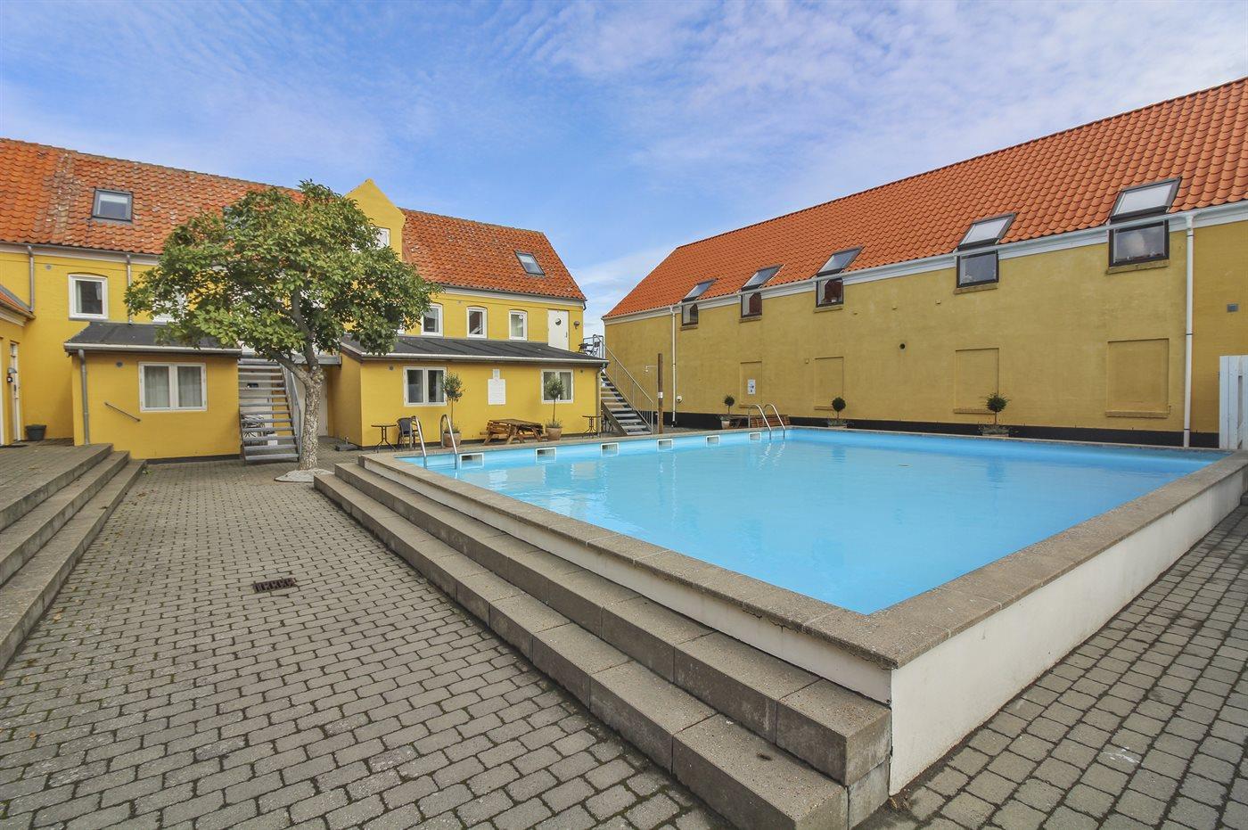 Hyggelig ferielejlighed i Gudhjem med gratis adgang til svømmehal, fælles pool og trådløst internet.