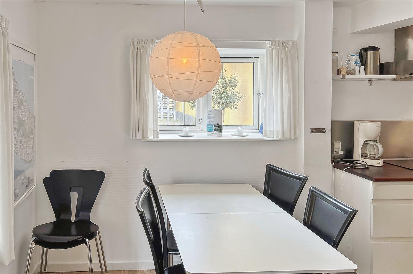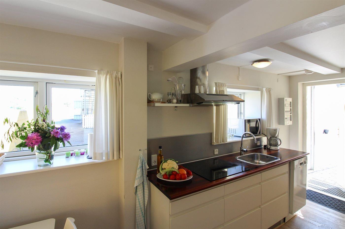 Køkkenet er udstyret med 1 køleskab. Der er 4 keramiske kogeplader, miniovn, mikrobølgeovn samt opvaskemaskine.