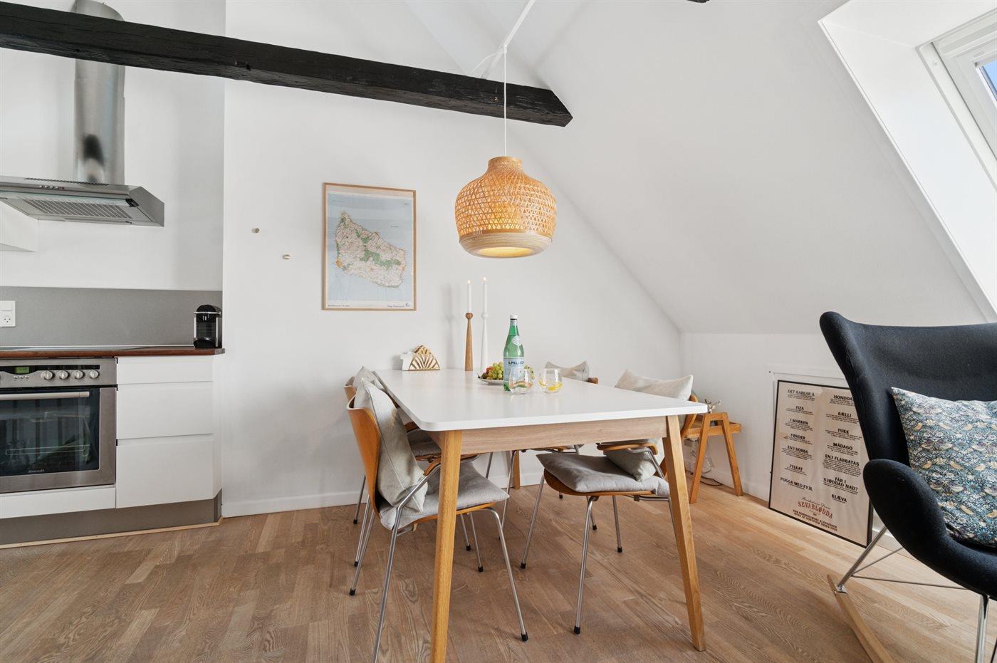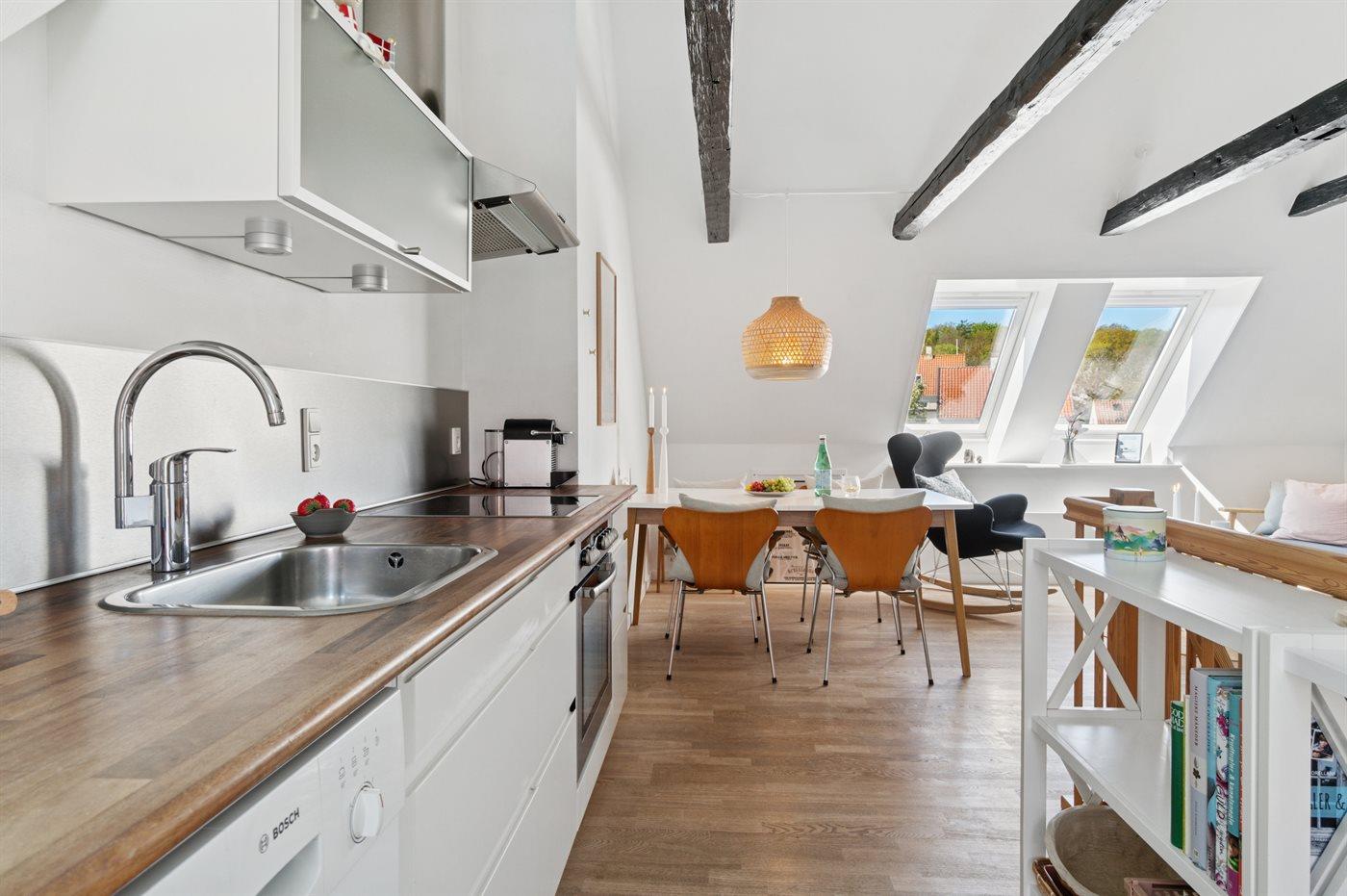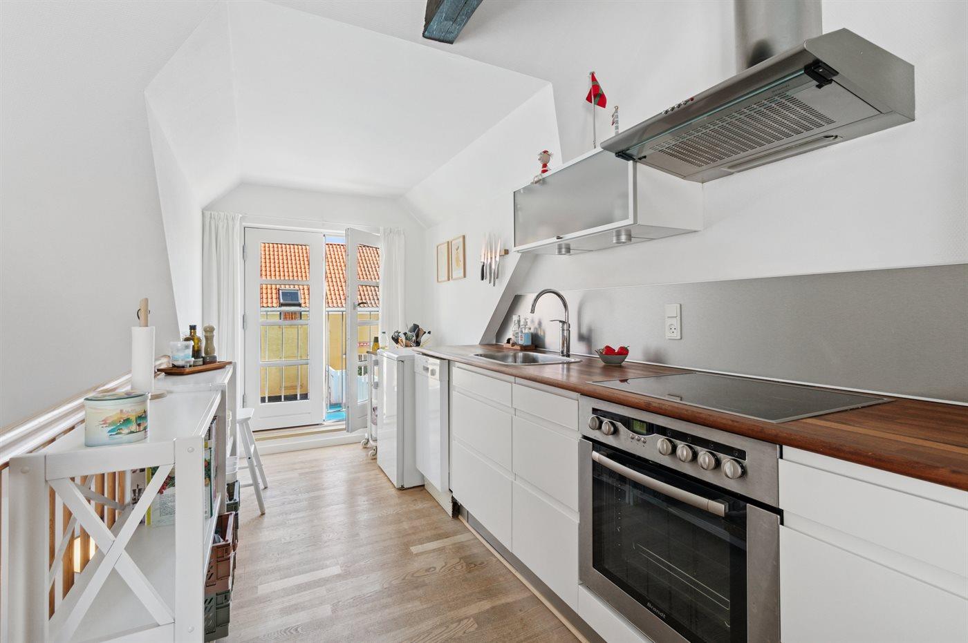 Køkkenet er udstyret med 1 køleskab. Der er 4 keramiske kogeplader, varmluftovn samt opvaskemaskine.